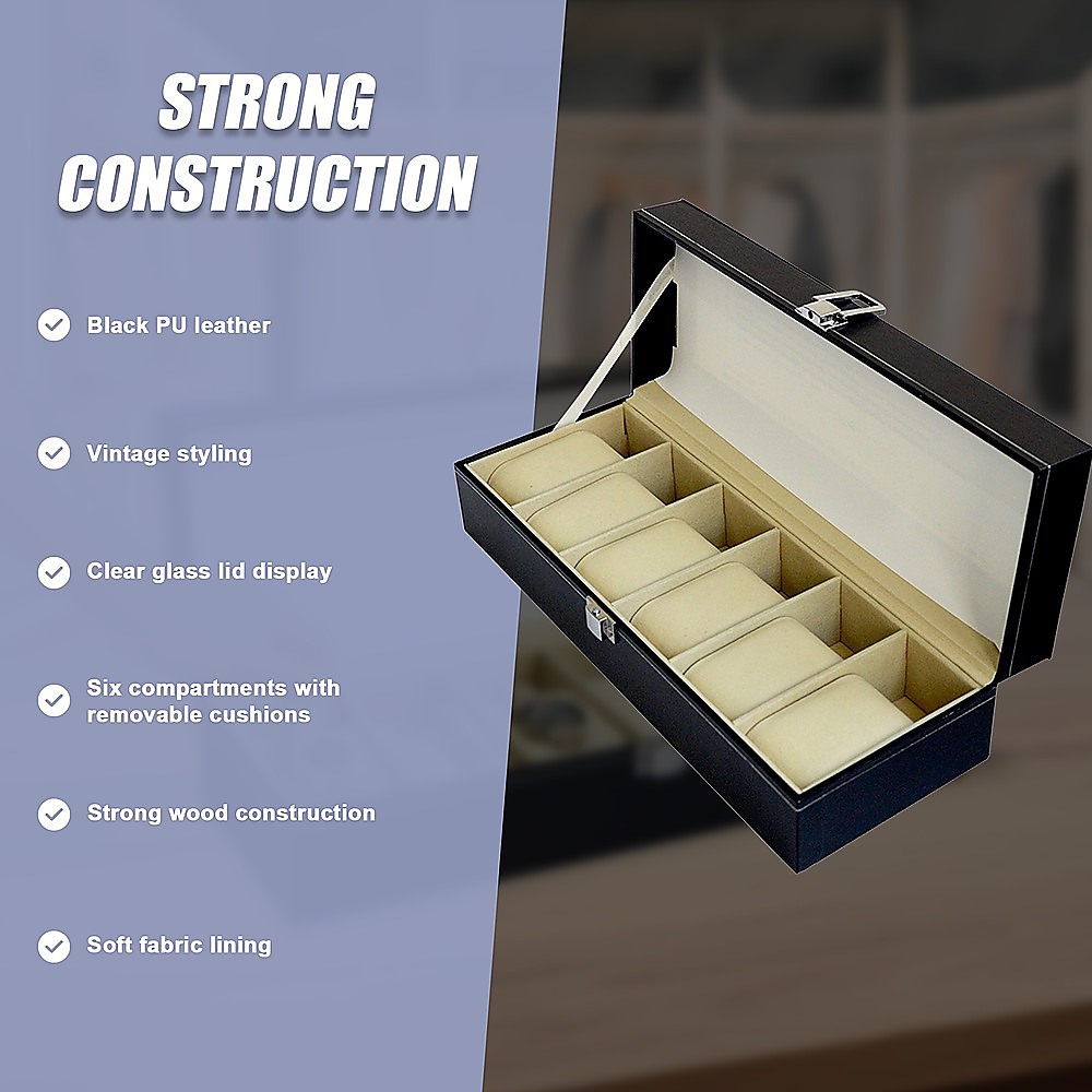 6 Slot Mens Watch Display Case Box Black PU Leather