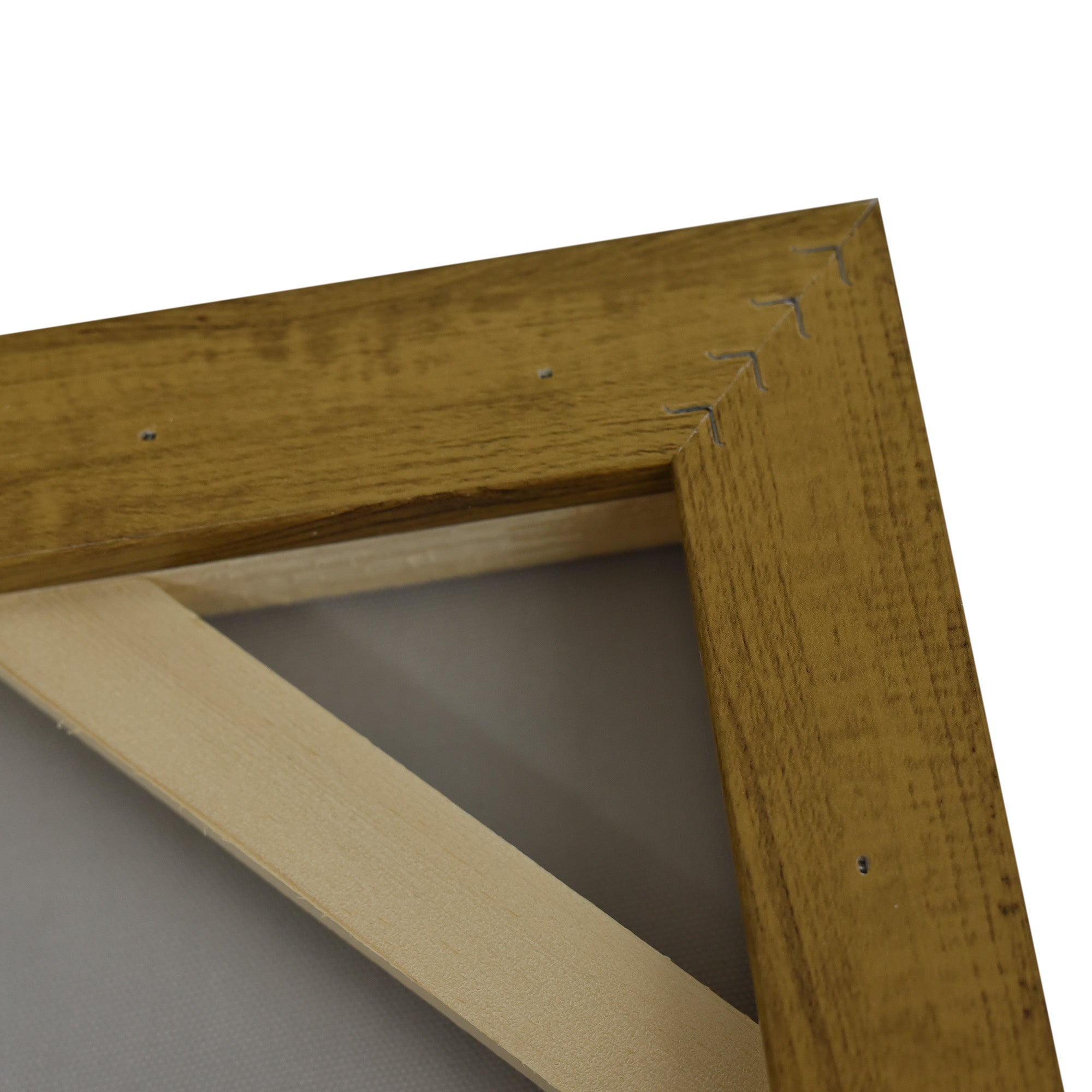 Stretched and gallery wrapped around a wooden stretcher and finished with a floating frame. There is a gap between the frame and print, which creates the floating effect and literally makes the canvas print stand out even more.