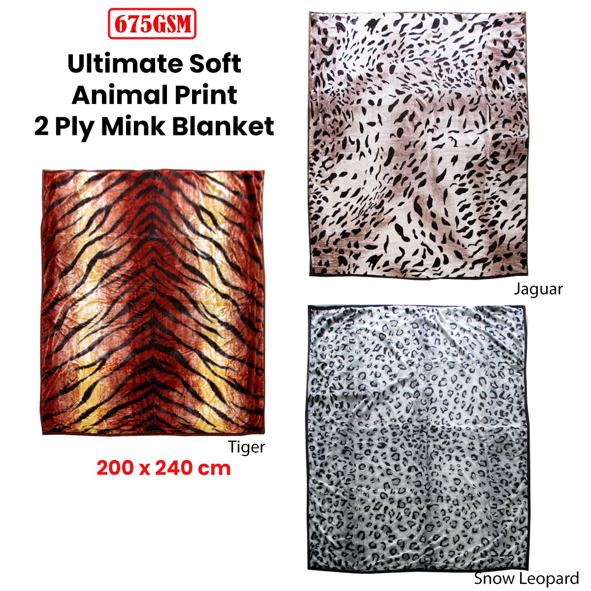 675gsm 2 Ply Animal Print Faux Mink Blanket Queen 200×240 cm Jaguar