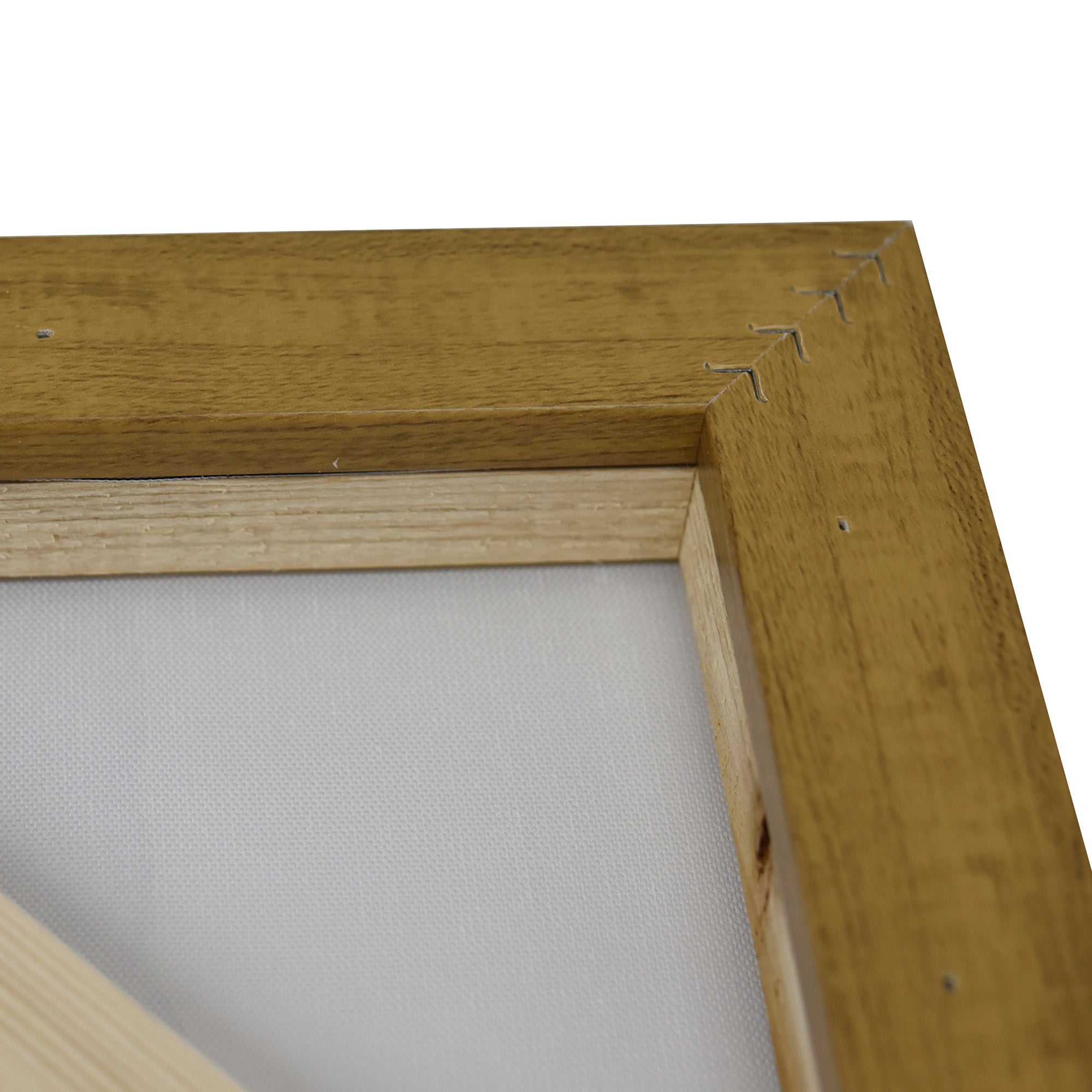 Stretched and gallery wrapped around a wooden stretcher and finished with a floating frame. There is a gap between the frame and print, which creates the floating effect and literally makes the canvas print stand out even more.