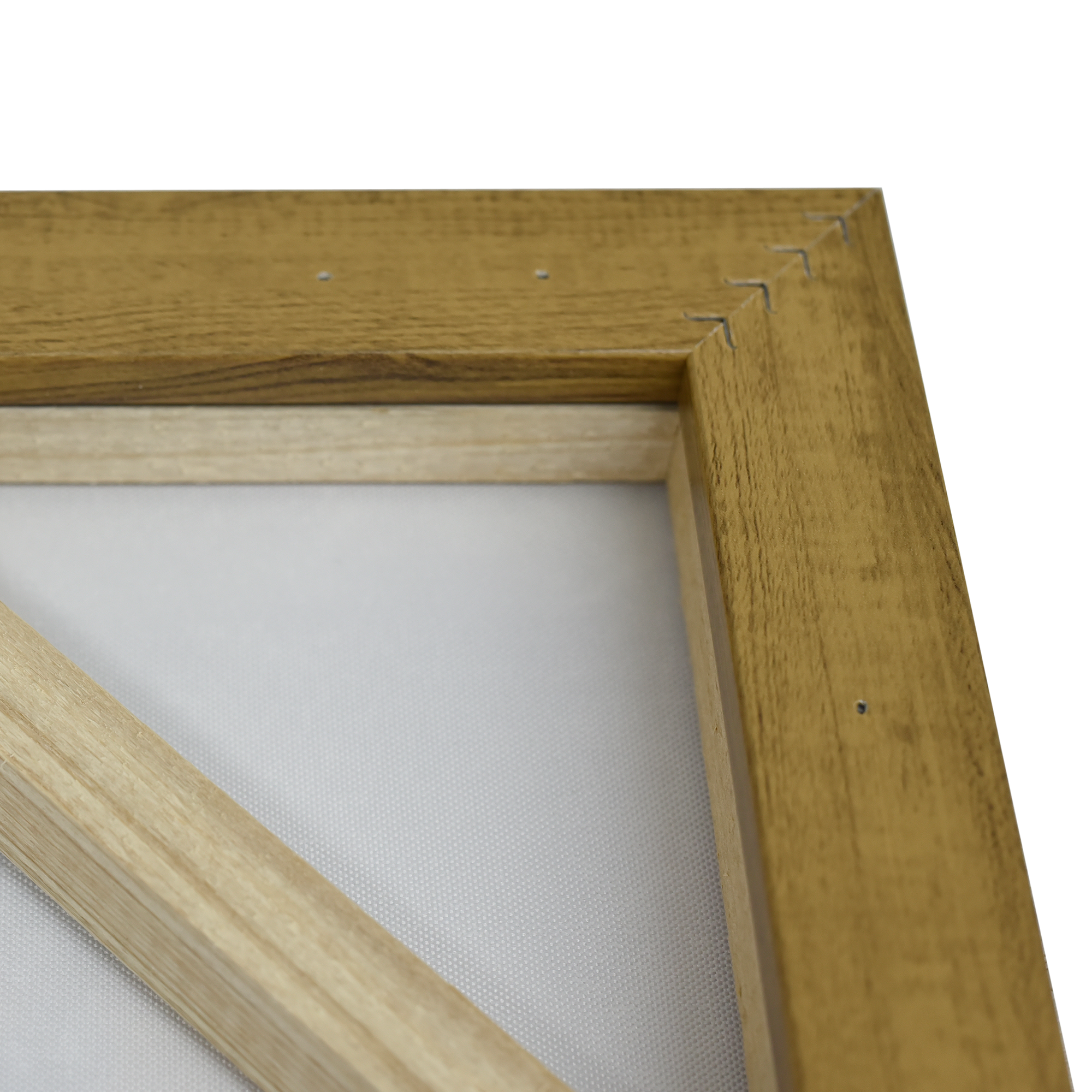 Stretched and gallery wrapped around a wooden stretcher and finished with a floating frame. There is a gap between the frame and print, which creates the floating effect and literally makes the canvas print stand out even more.