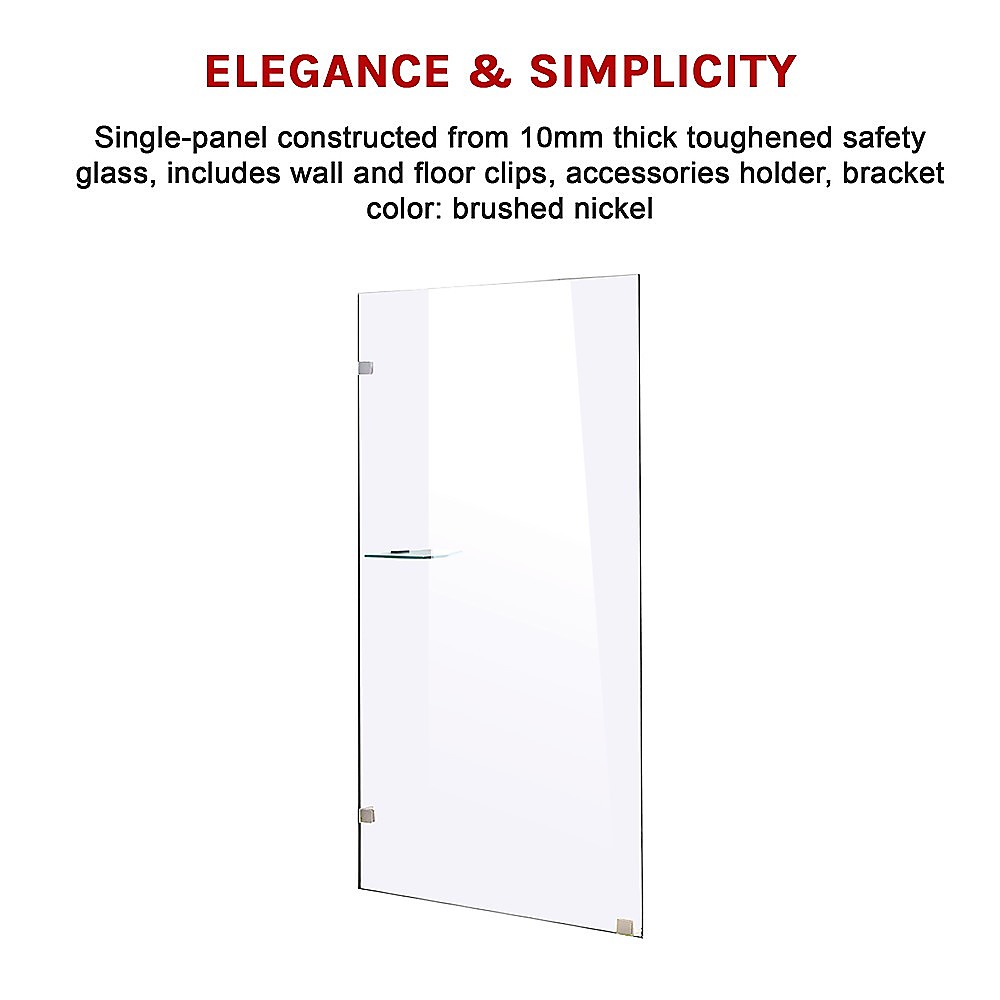 This single-panel screen is crafted from a 10mm-thick toughened safety glass. In addition to its crystal clarity, this glass is specifically designed to ensure absolute safety in the bathroom, meeting all applicable Australian Standards. Three sturdy and premium brass clips one for the floor, two for the wall are included for a straightforward, hassle-free installation. This panel measures 900mm wide by 2000mm high.