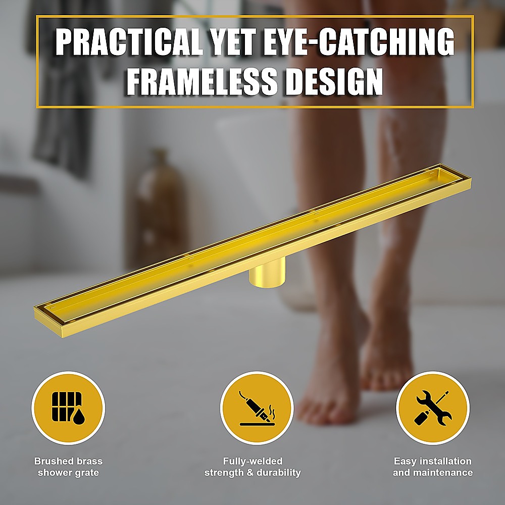 The practical yet eye-catching brushed brass shower grate features a frameless design that allows it to be seamlessly inserted into the shower's tiling configuration. The grate with its high quality construction provides durability and longevity as well as resistance to corrosion.