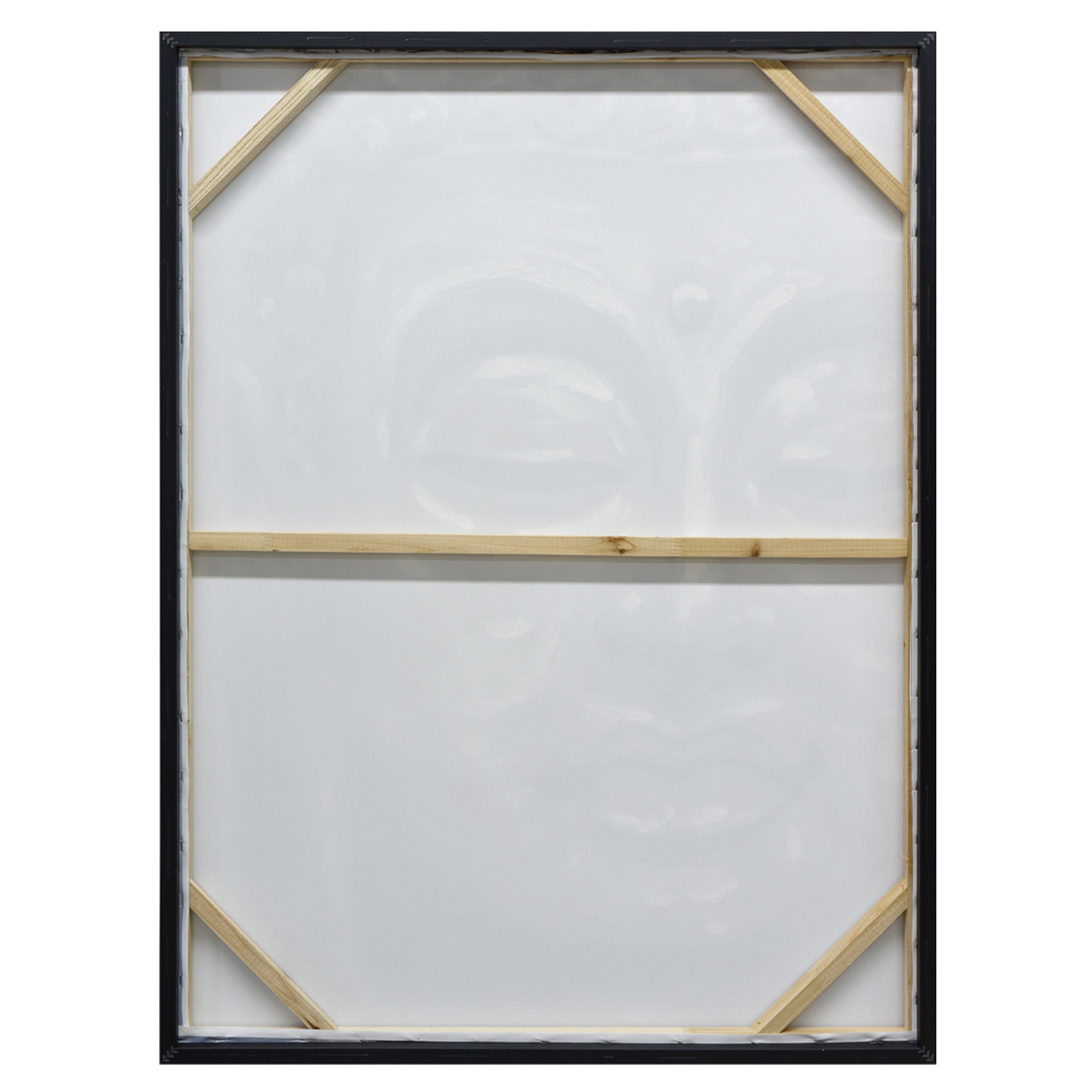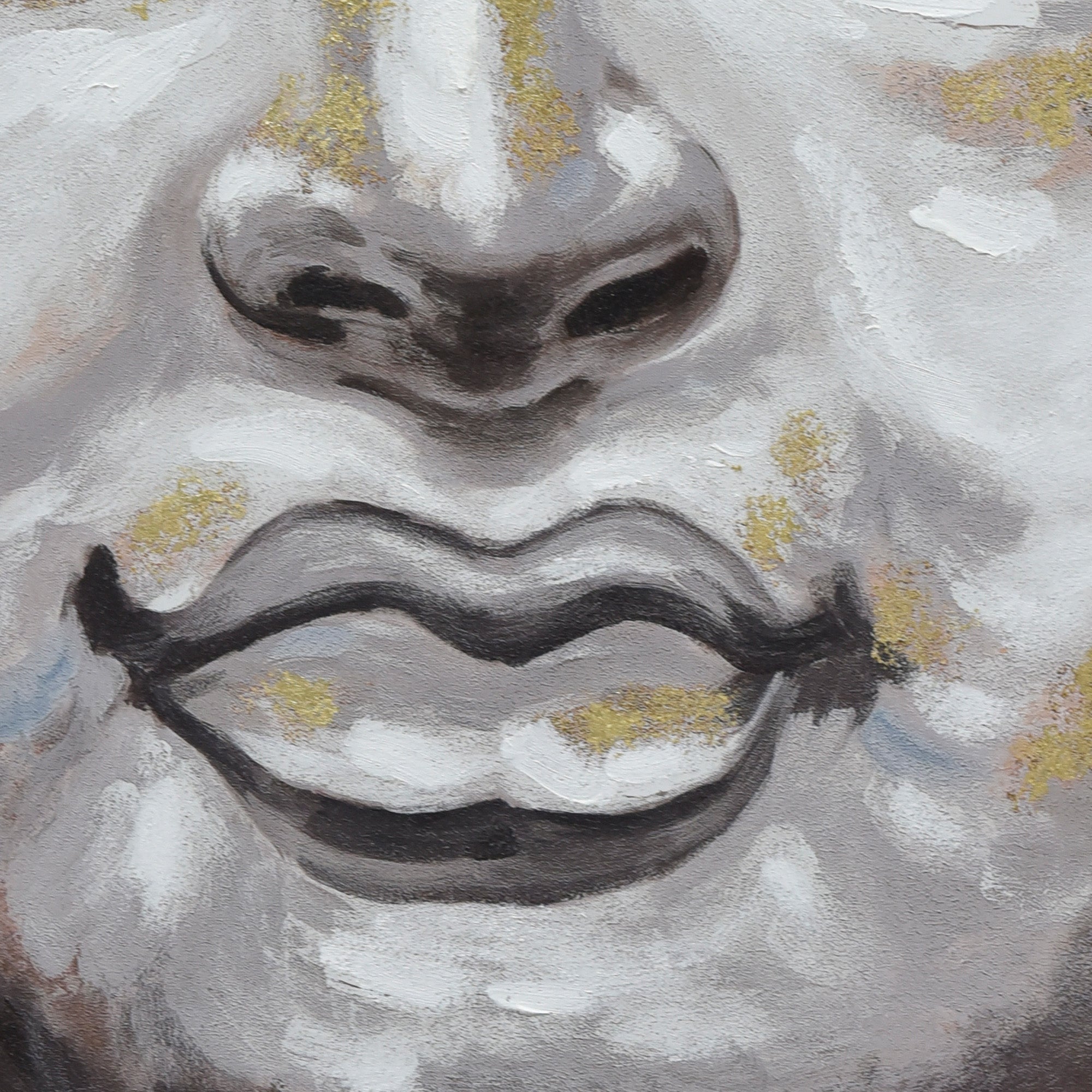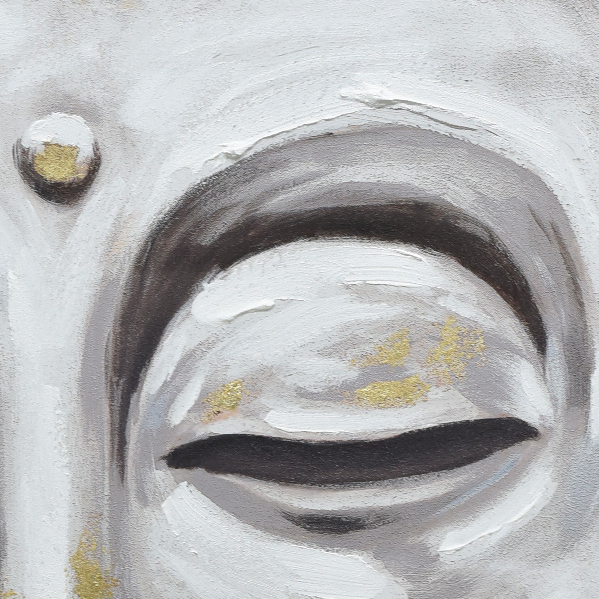 “Serene Radiance” is an evocative portrayal of spiritual tranquility, capturing the essence of Buddha in a close-up, almost intimate rendering. Bathed in soft hues of light grey and white, the visage exudes an aura of peace and introspection, amplified by the closed eyes that hint at deep meditation. The gold highlights delicately accentuate the facial contours, adding a touch of opulence to the subdued palette. This ethereal face occupies the majority of the canvas, with the three-quarter positioning allowing for a glimpse of the serene light blue backdrop on the right. The choice of a champagne frame complements the artwork, elevating its elegance. Crafted with a blend of hand-painted and printed techniques, “Serene Radiance” serves as a poignant reminder of the inner peace that lies within, beckoning viewers to pause, reflect, and find solace.