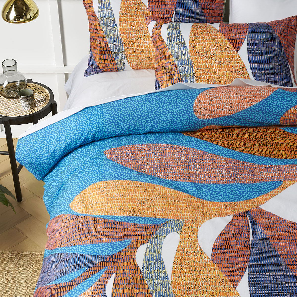 Bring a bold, artistic touch to your bedroom with the Sorrel White Cotton Foliage Quilt Cover Set by Accessorize. Featuring a striking leaf-inspired design in vibrant white, brown, black, blue, red, and purple tones, this set instantly brightens up your space. Made from soft, breathable cotton, it offers a cosy and comfortable night’s sleep while keeping your decor fresh and modern. Whether you love a tropical vibe or a contemporary aesthetic, this quilt cover set is a stunning statement piece for any bedroom.