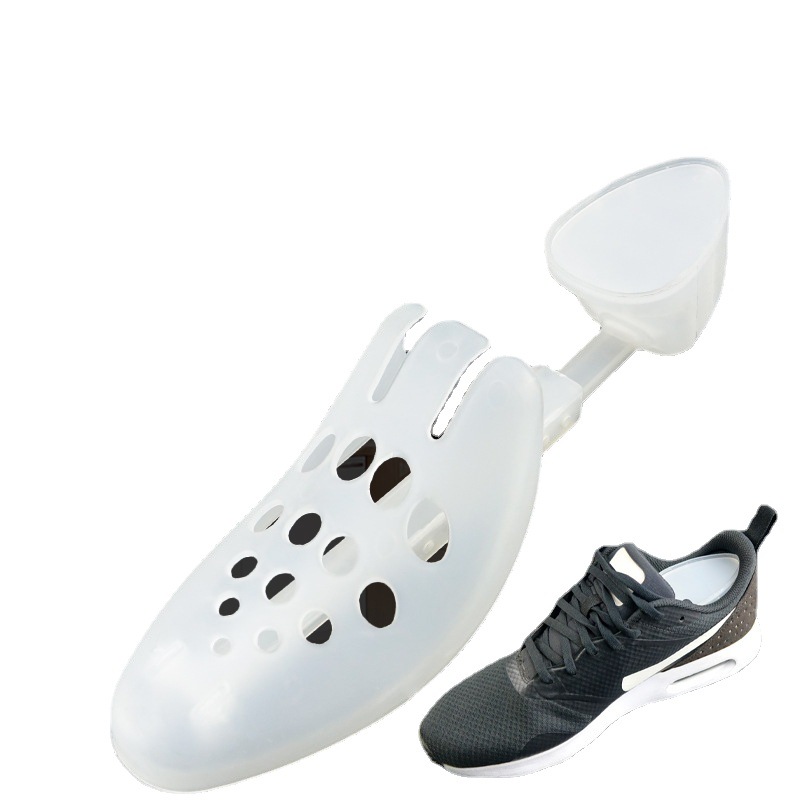 Adjustable transparent shoe tree stretcher, suitable for sizes EUR 40-45. This pair of shoe trees helps maintain the shape of your shoes, prevent creases, and extend the lifespan of your footwear. The lightweight and flexible design makes it easy to adjust and insert into different types of shoes, while the ventilation holes help keep shoes fresh and odor-free. Ideal for keeping your shoes in great condition.