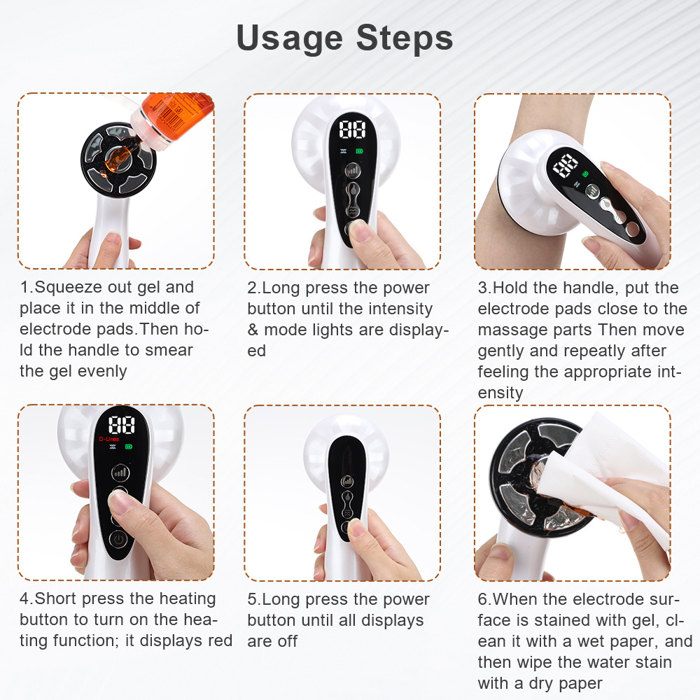 - Hold the handle, place the electrode pads close to the massage parts. Then move gently and repeatedly after feeling the appropriate intensity.