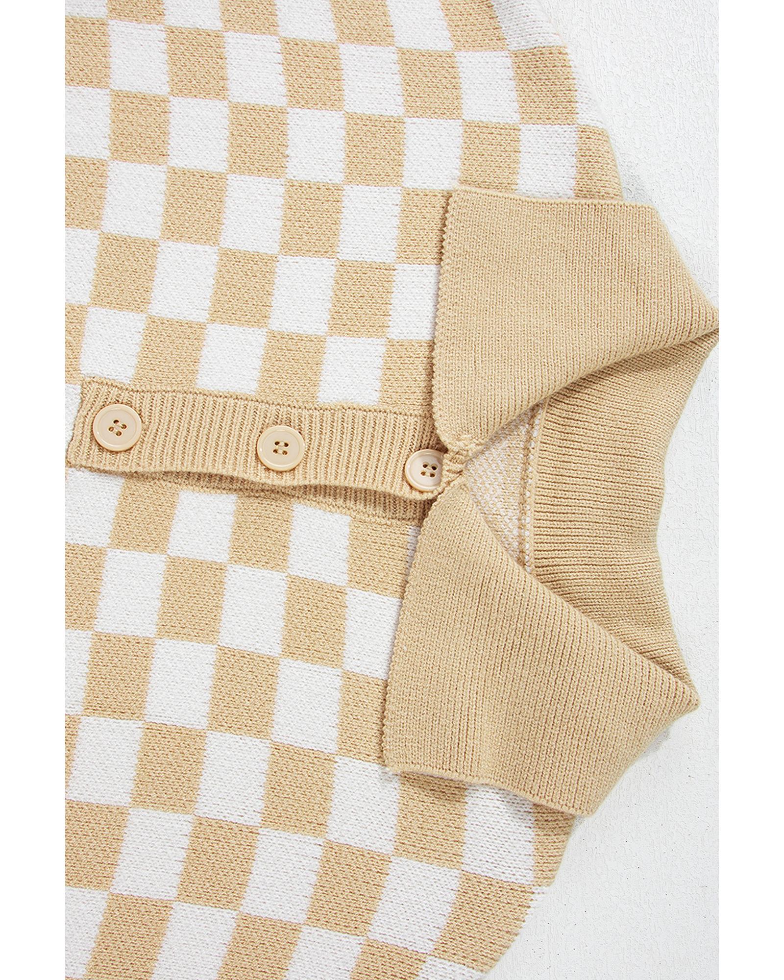 Apricot Checkered Buttons Collar V Neck Drop Shoulder Sweater – L