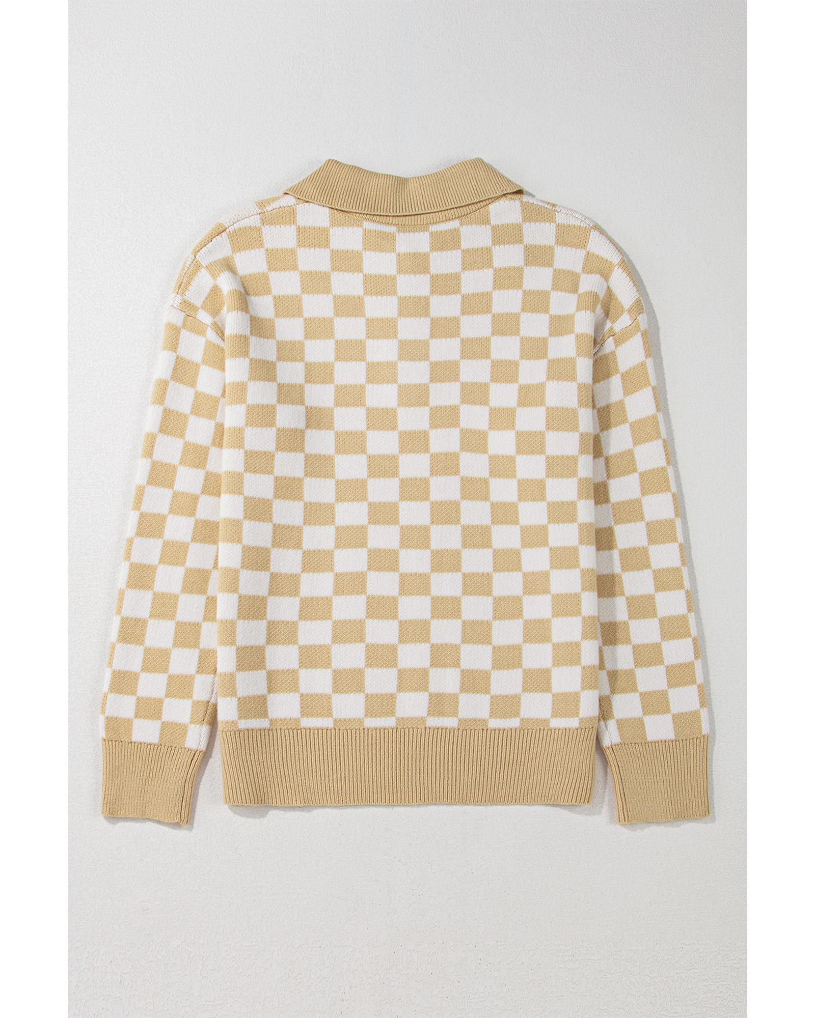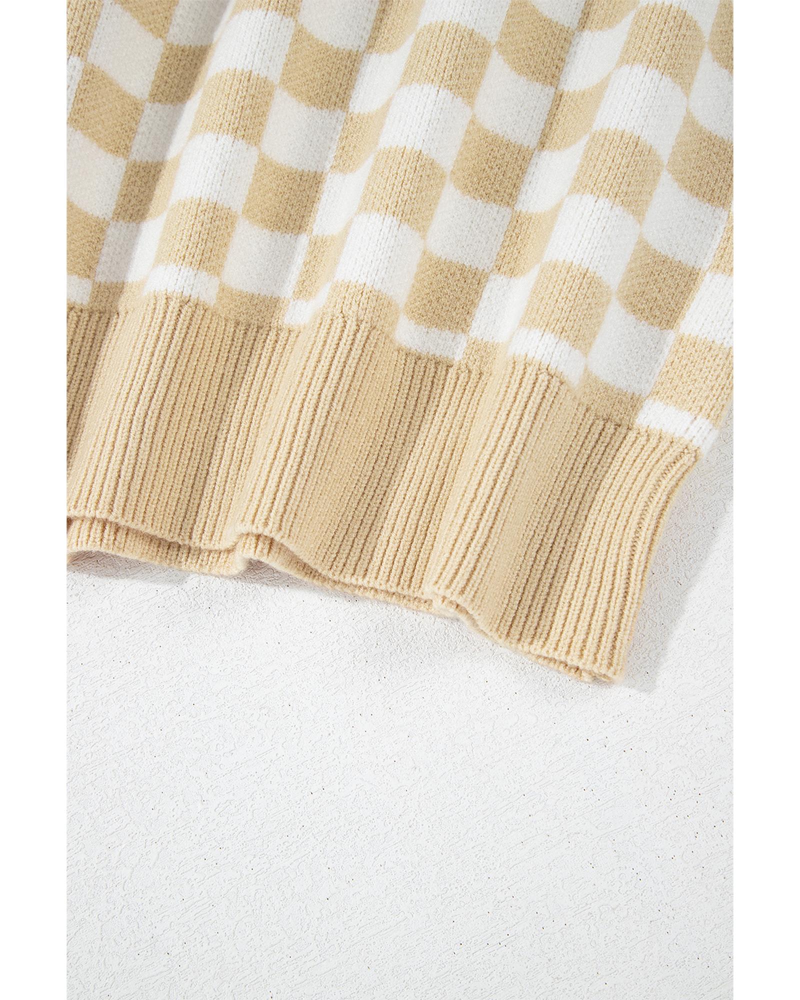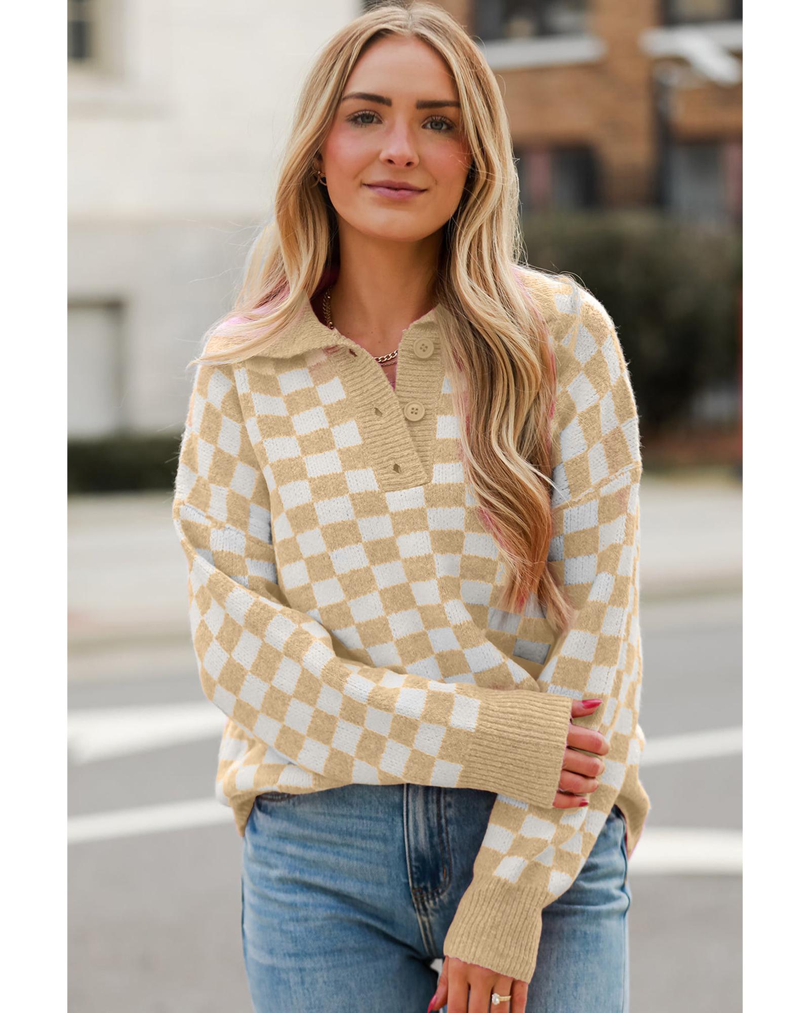 Apricot Checkered Buttons Collar V Neck Drop Shoulder Sweater – XL