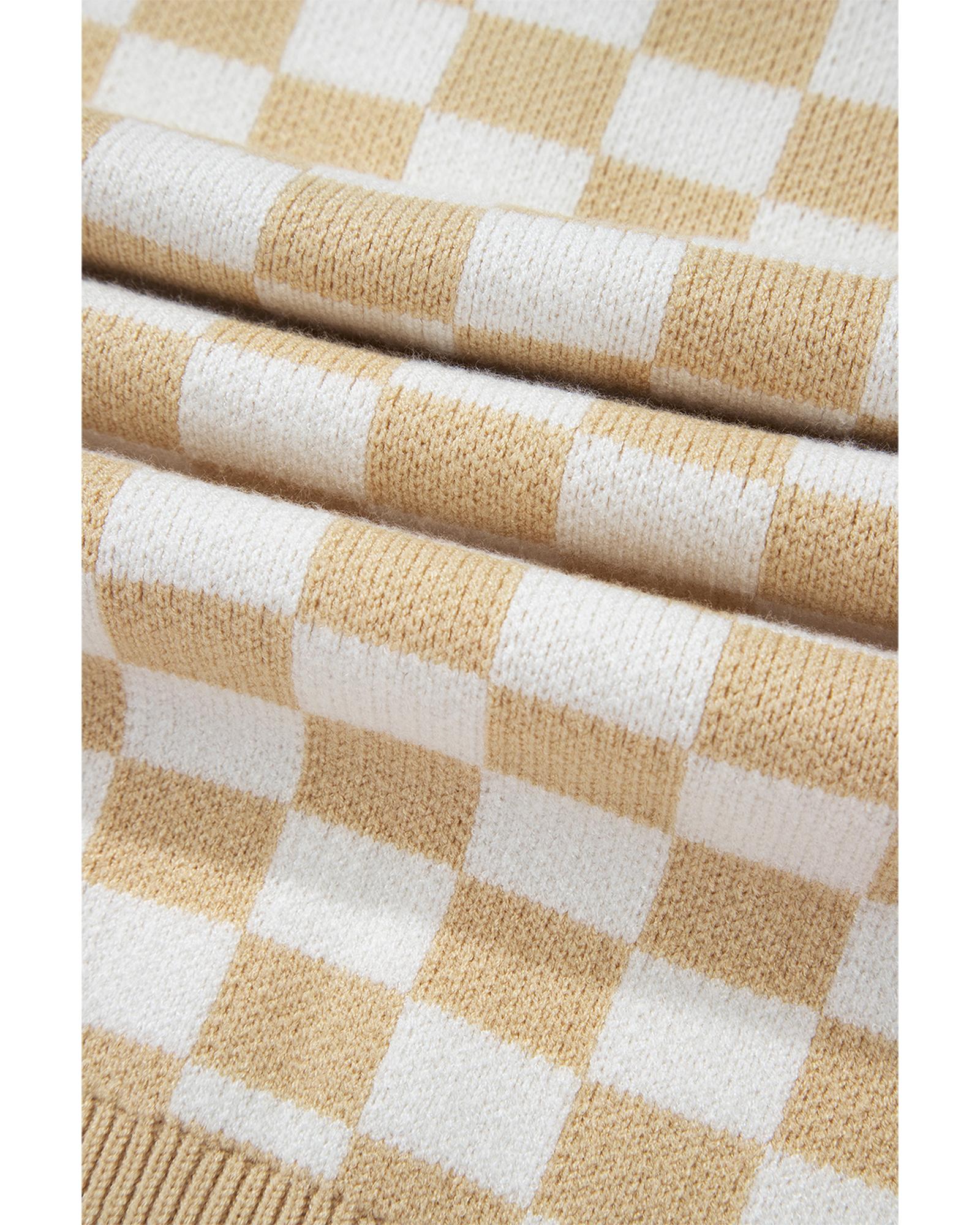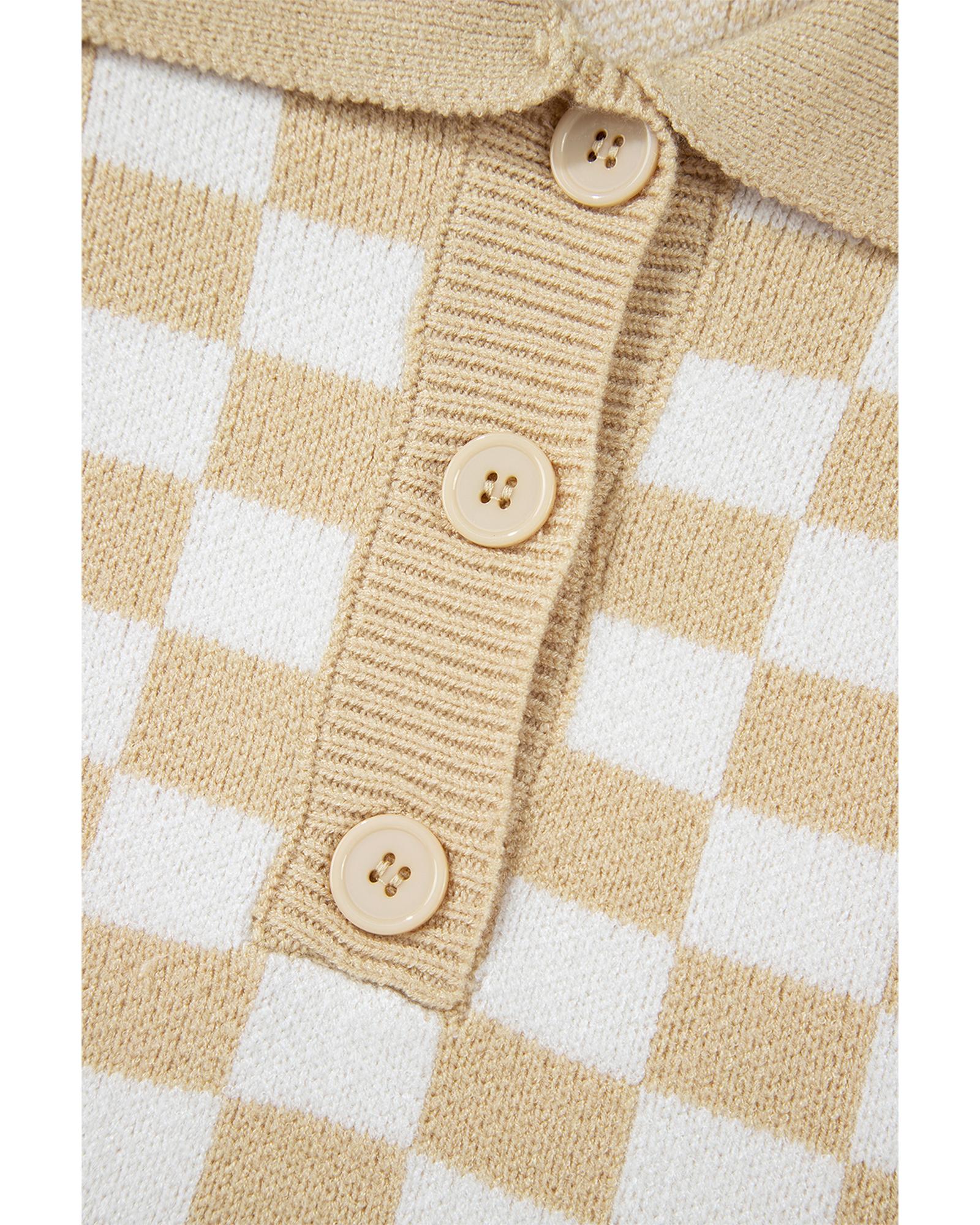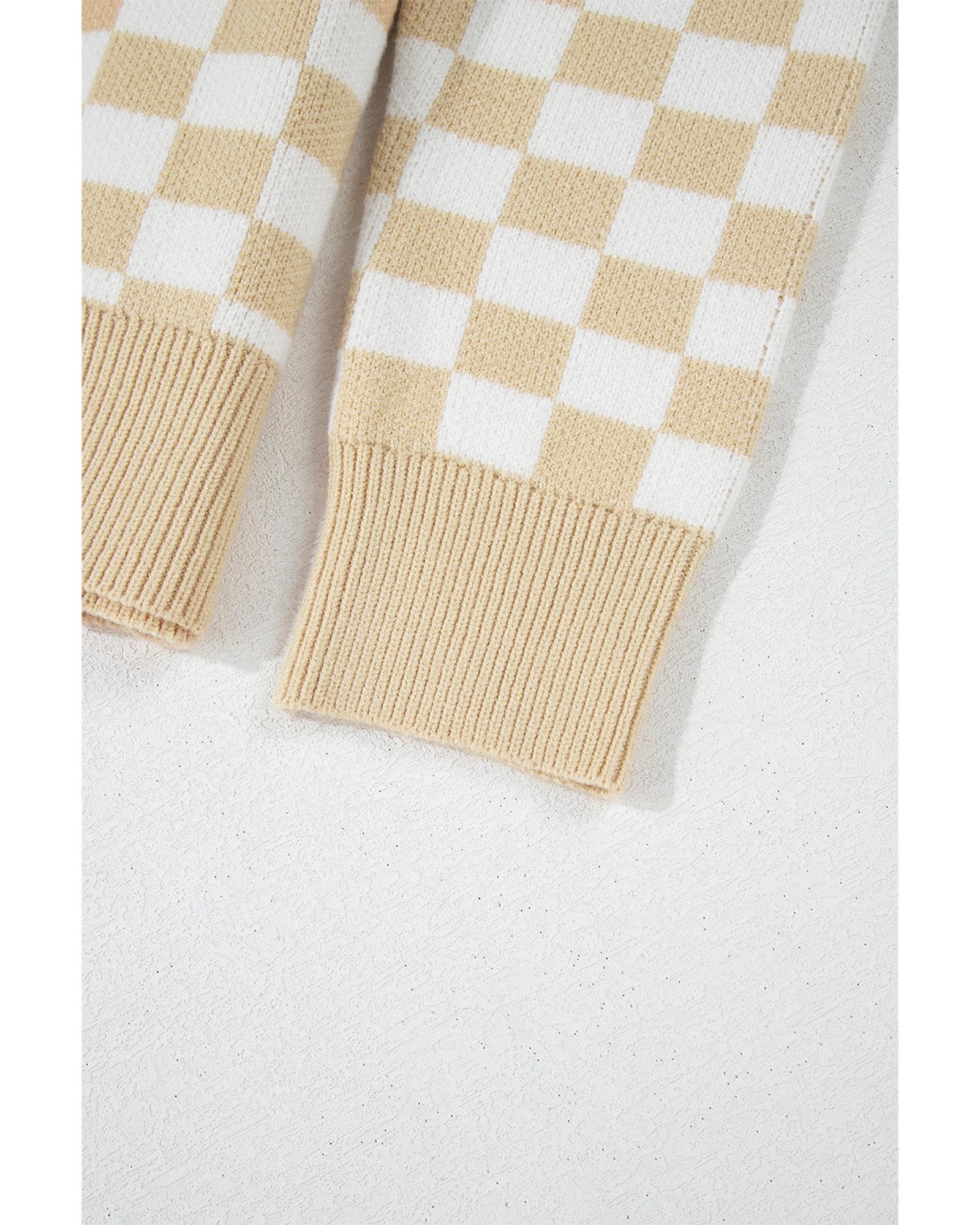 Apricot Checkered Buttons Collar V Neck Drop Shoulder Sweater – XL