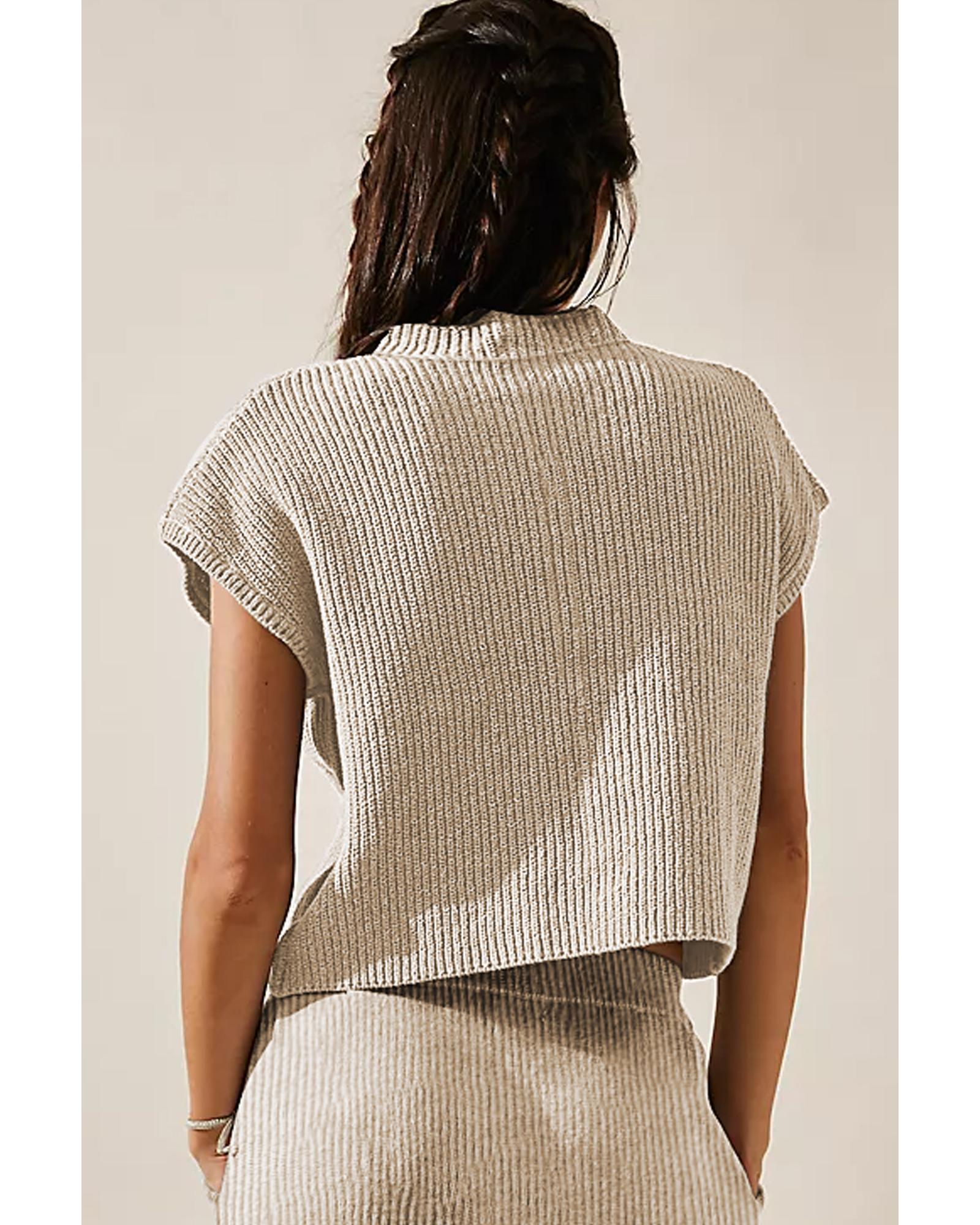 Apricot Chest Pocket V Neck Ribbed Cap Sleeve Sweater – M