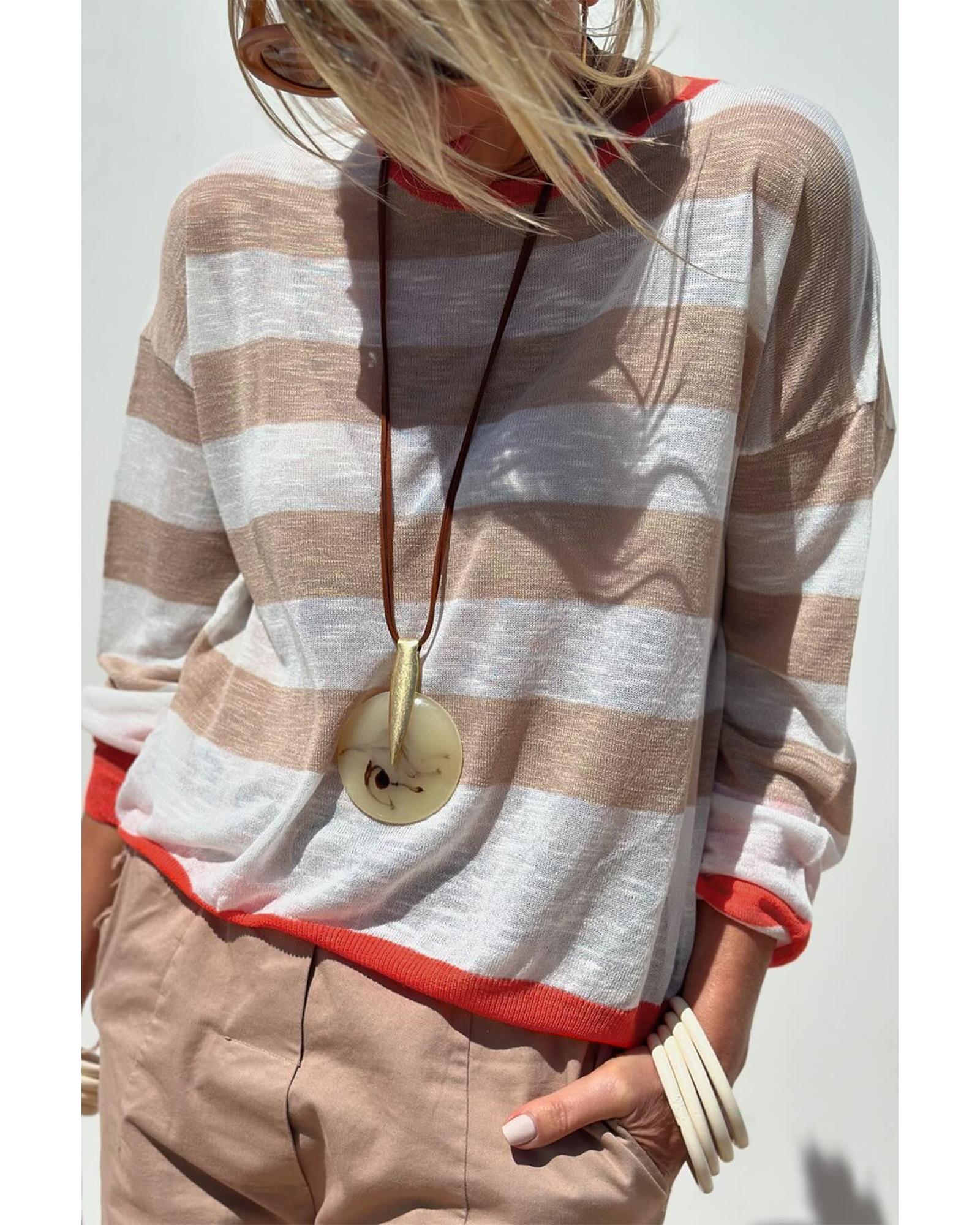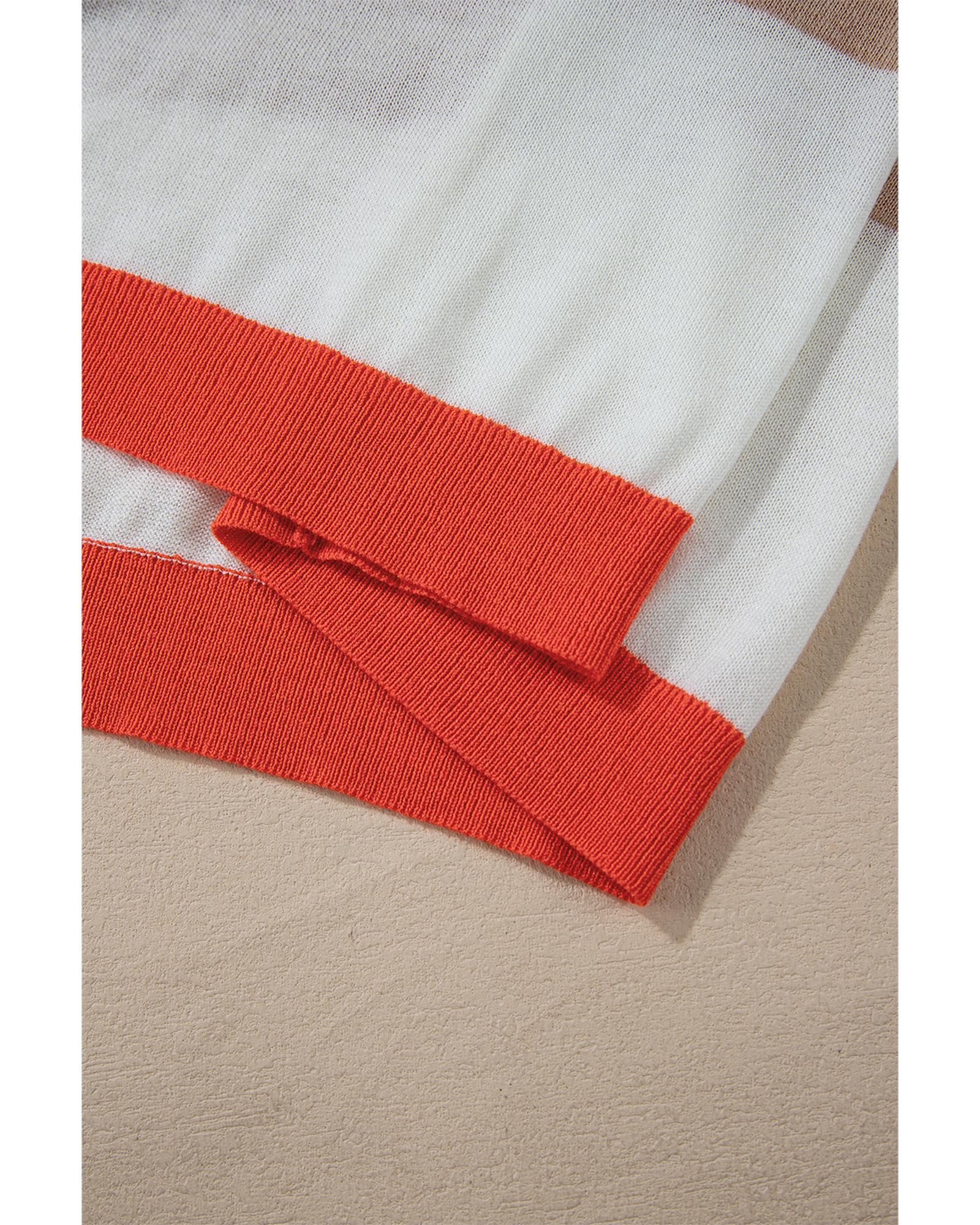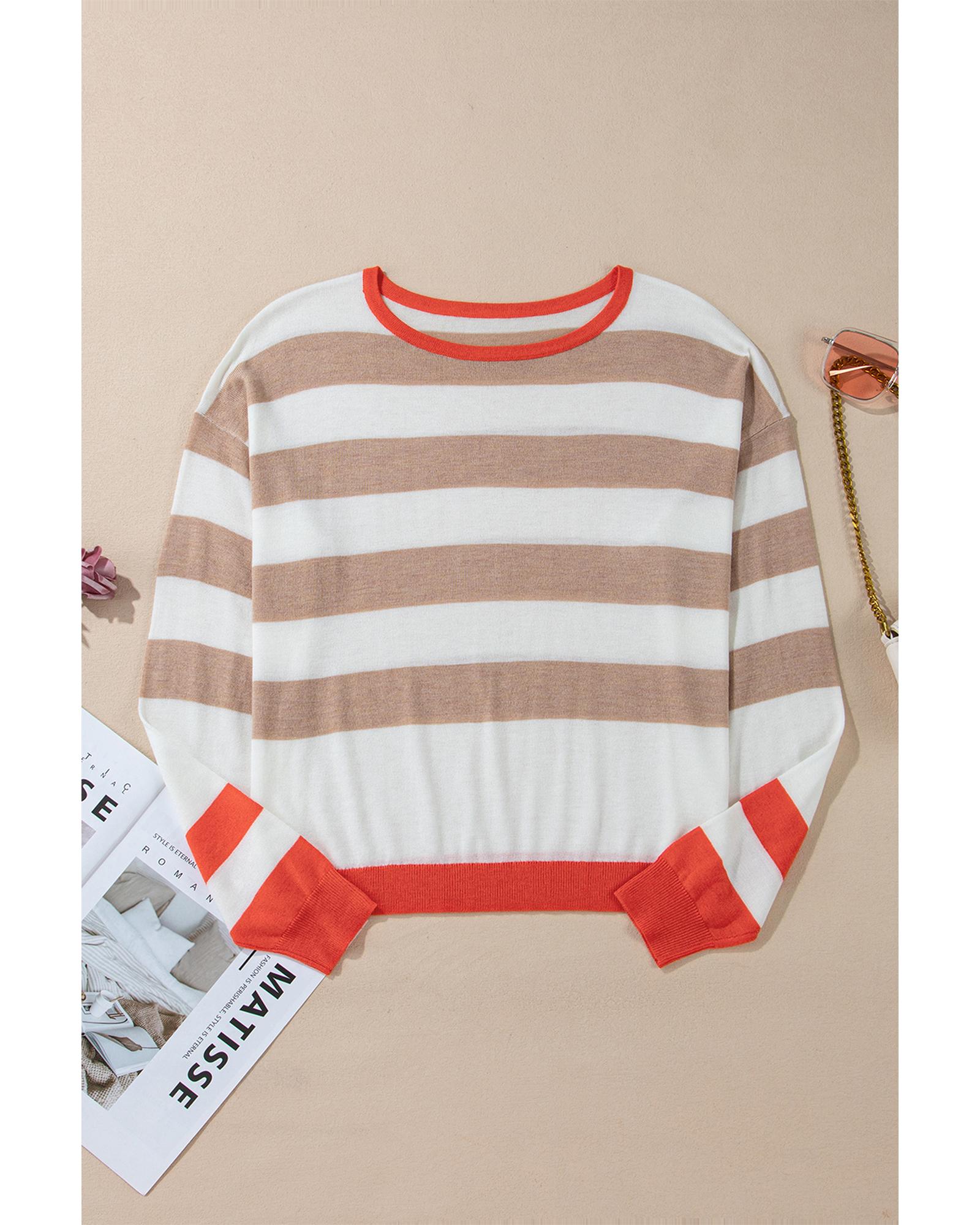 Apricot Colorblock Striped Round Neck Drop Shoulder Sweater – L