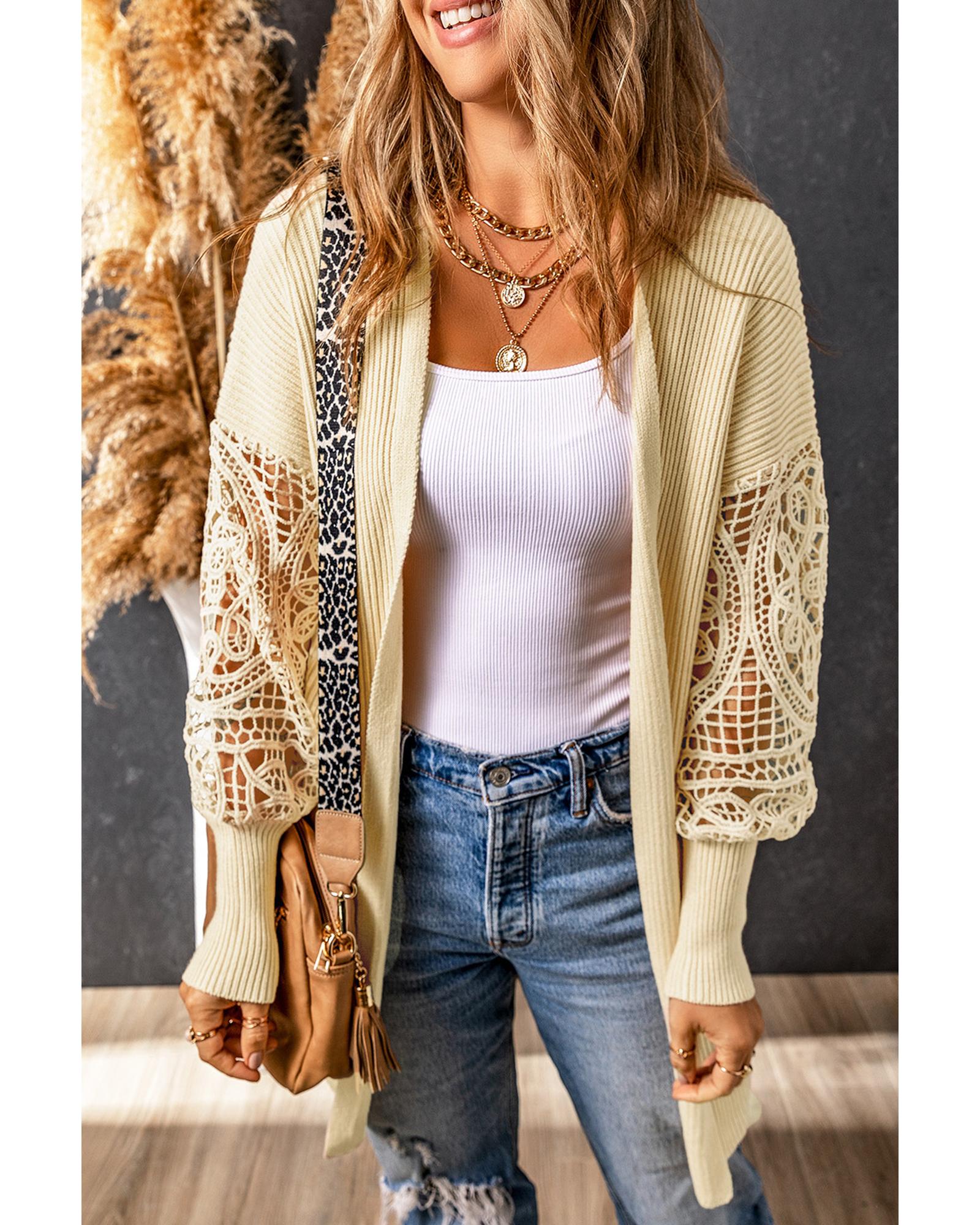 Apricot Crochet Lace Sleeve Ribbed Knit Cardigan – L