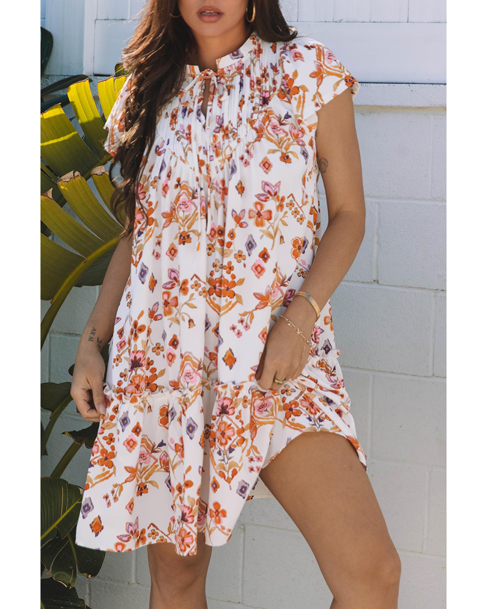Apricot Floral Geometric Print Ruffled Trim Flutter Sleeve Mini Dress – XL