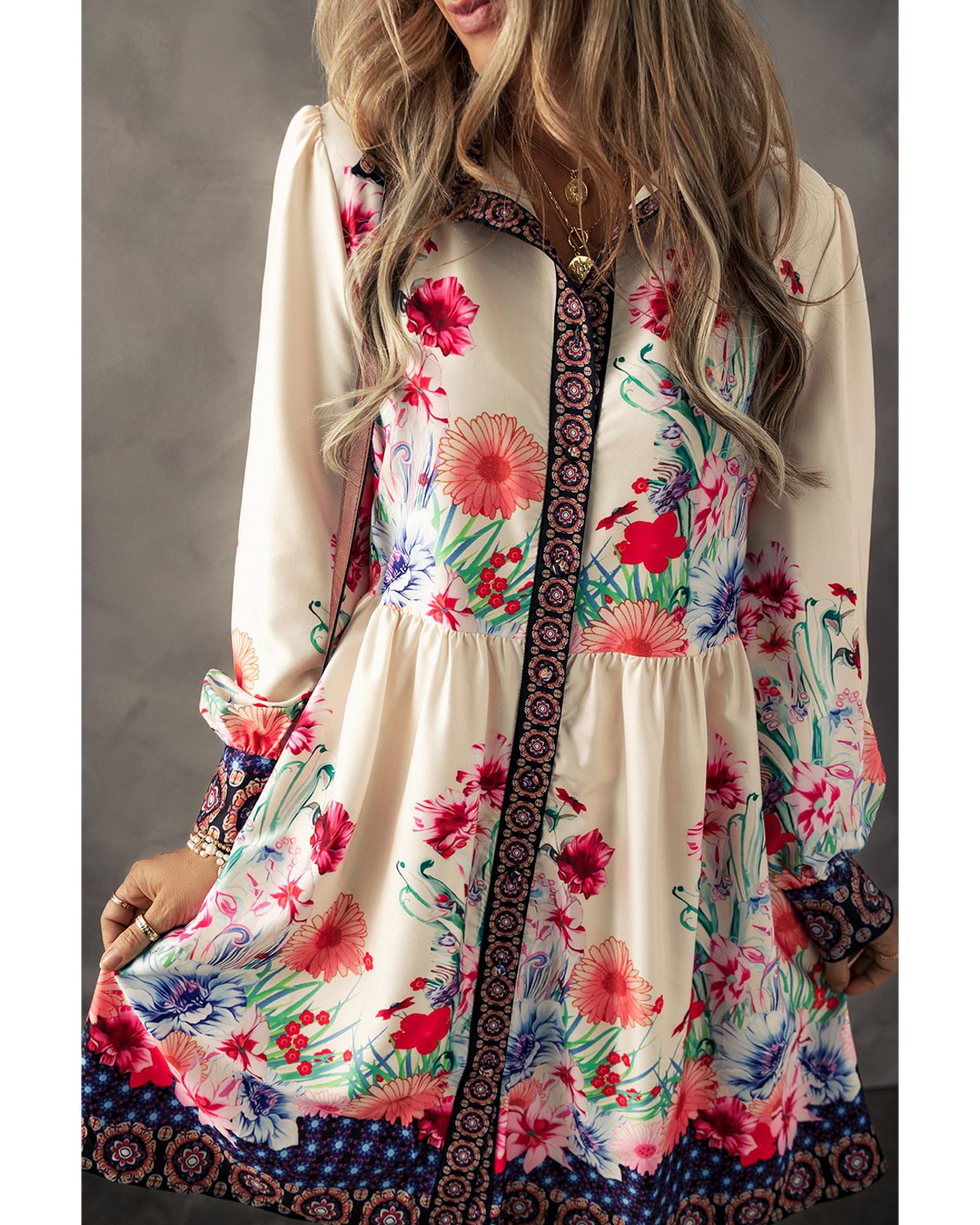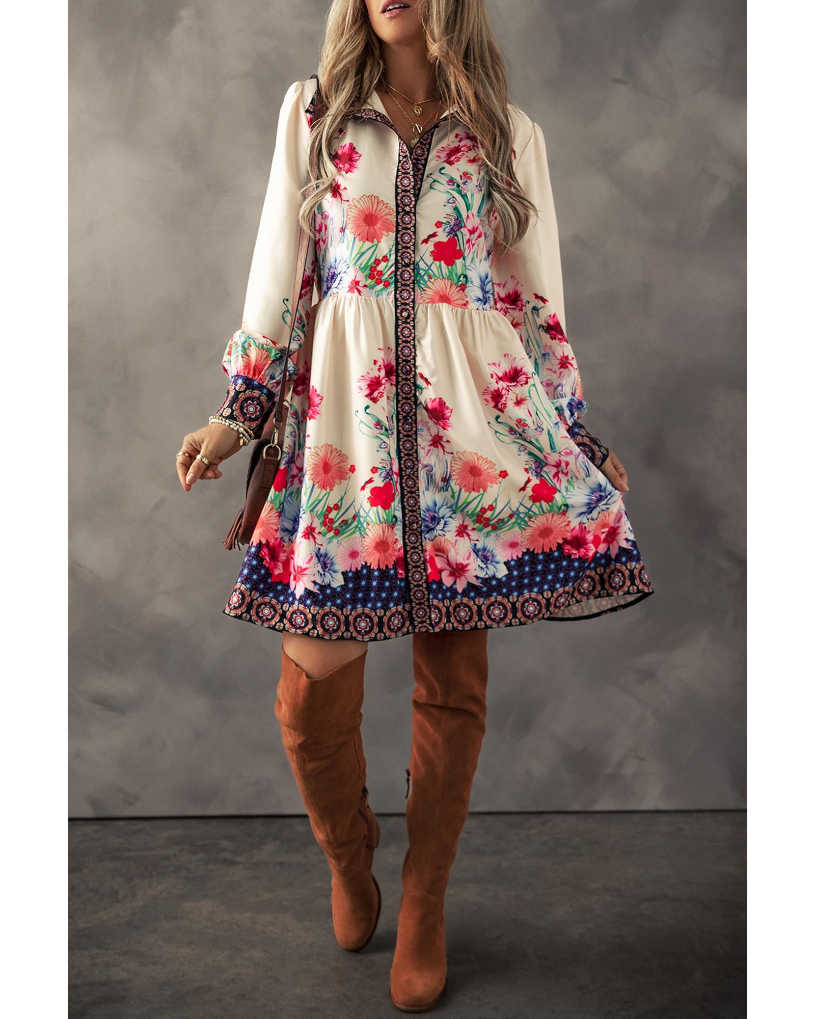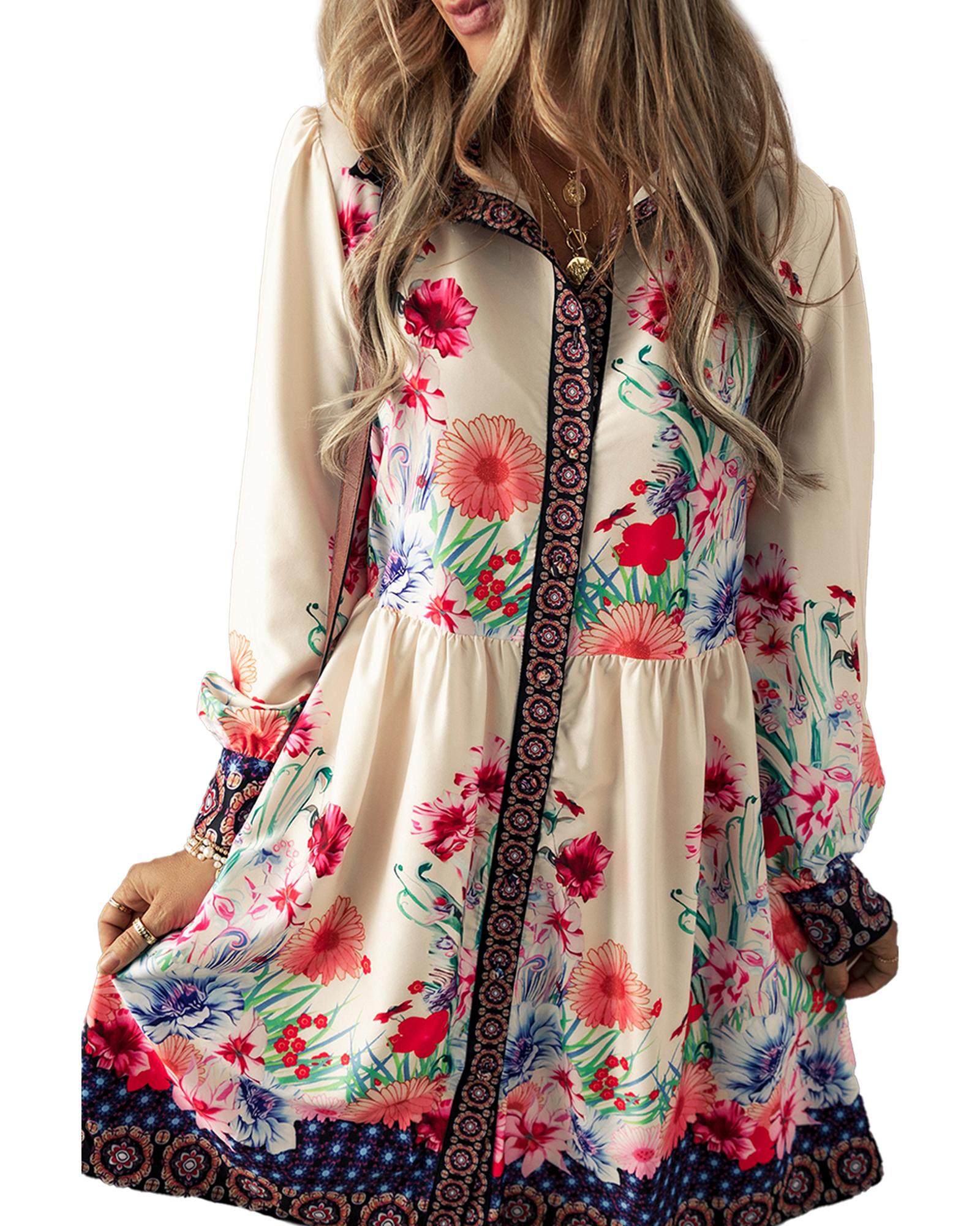 Apricot Floral Print Buttoned High Waist Shirt Mini Dress – XL