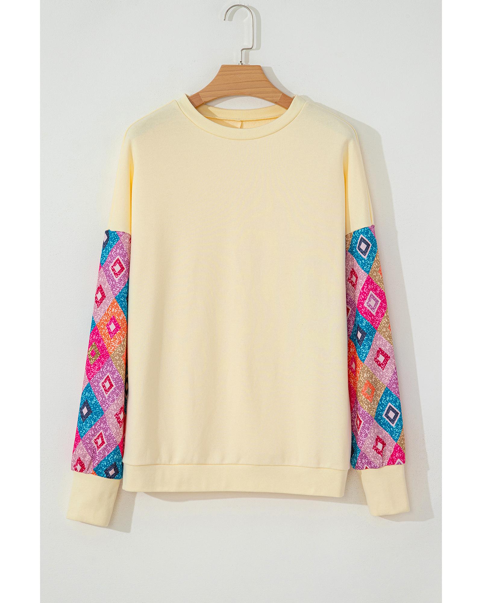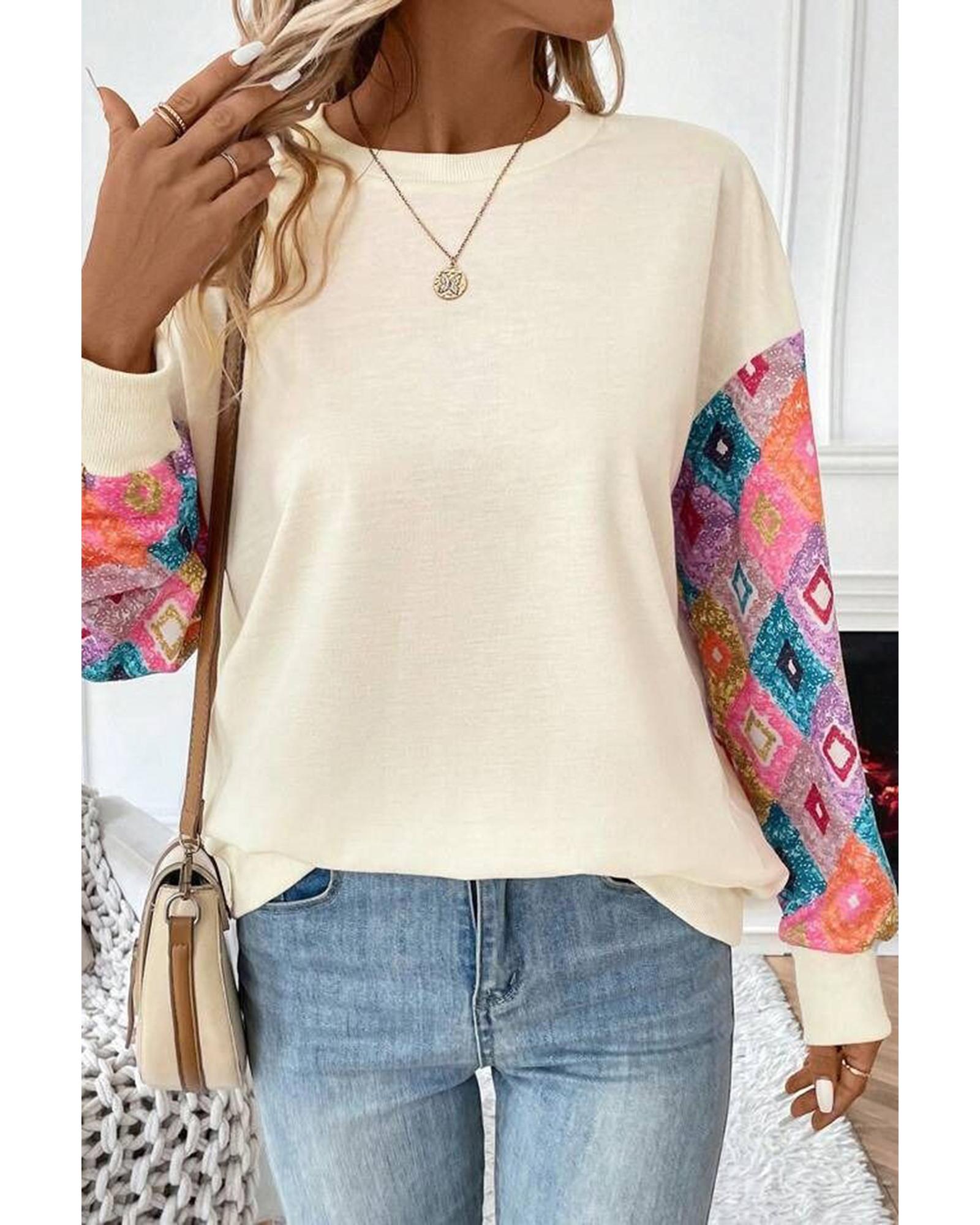 Apricot Geometric Printed Patchwork Long Sleeve Round Neck Top – XL
