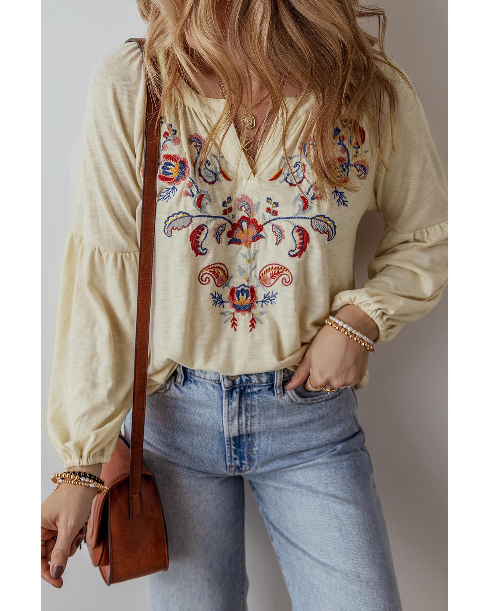Beau Blue Floral Embroidered Puff Sleeve Split Neck Blouse - S Original price was: $74.99.Current price is: $40.99.