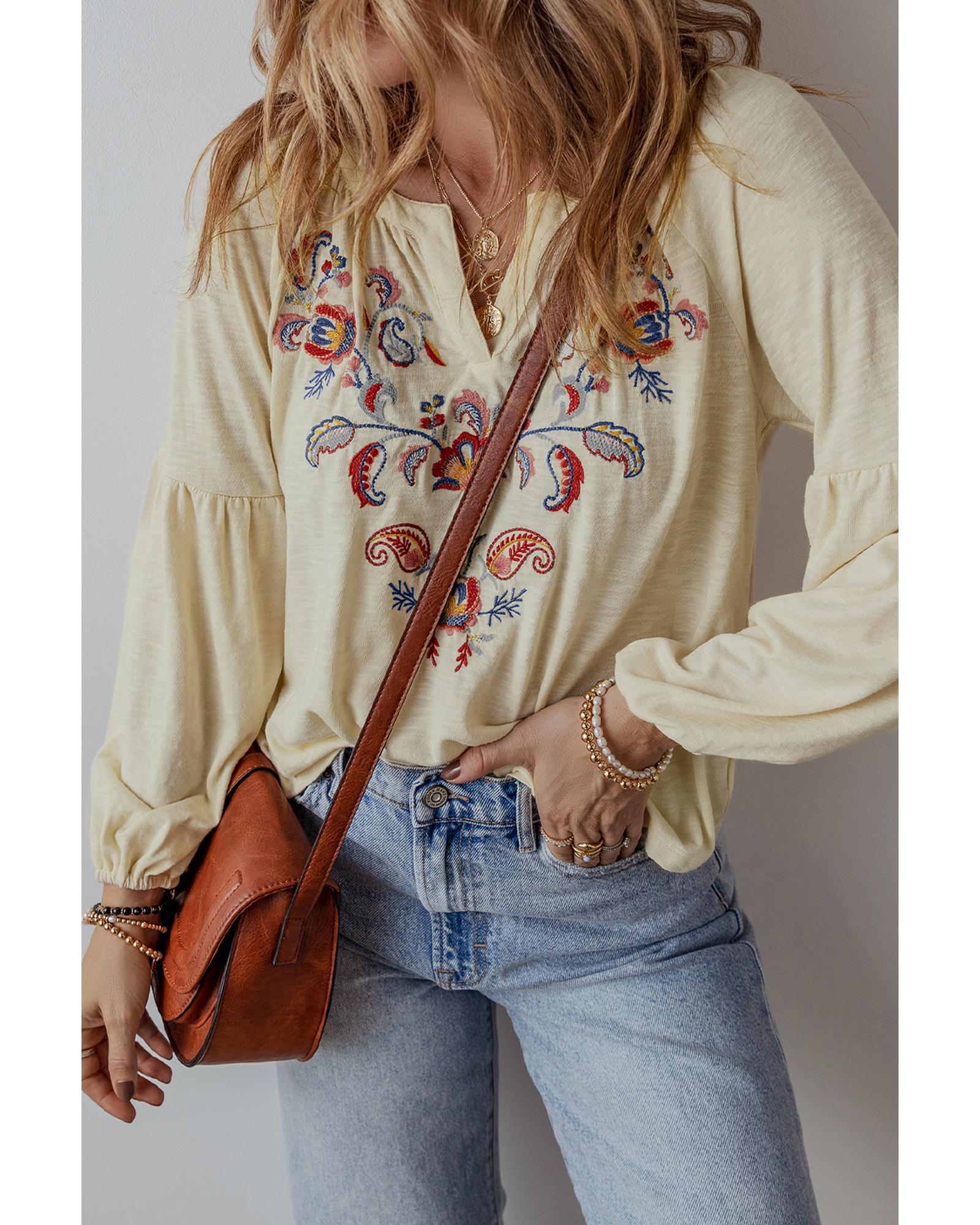 Apricot Paisley Floral Embroidered Notch V Neck Blouse – M