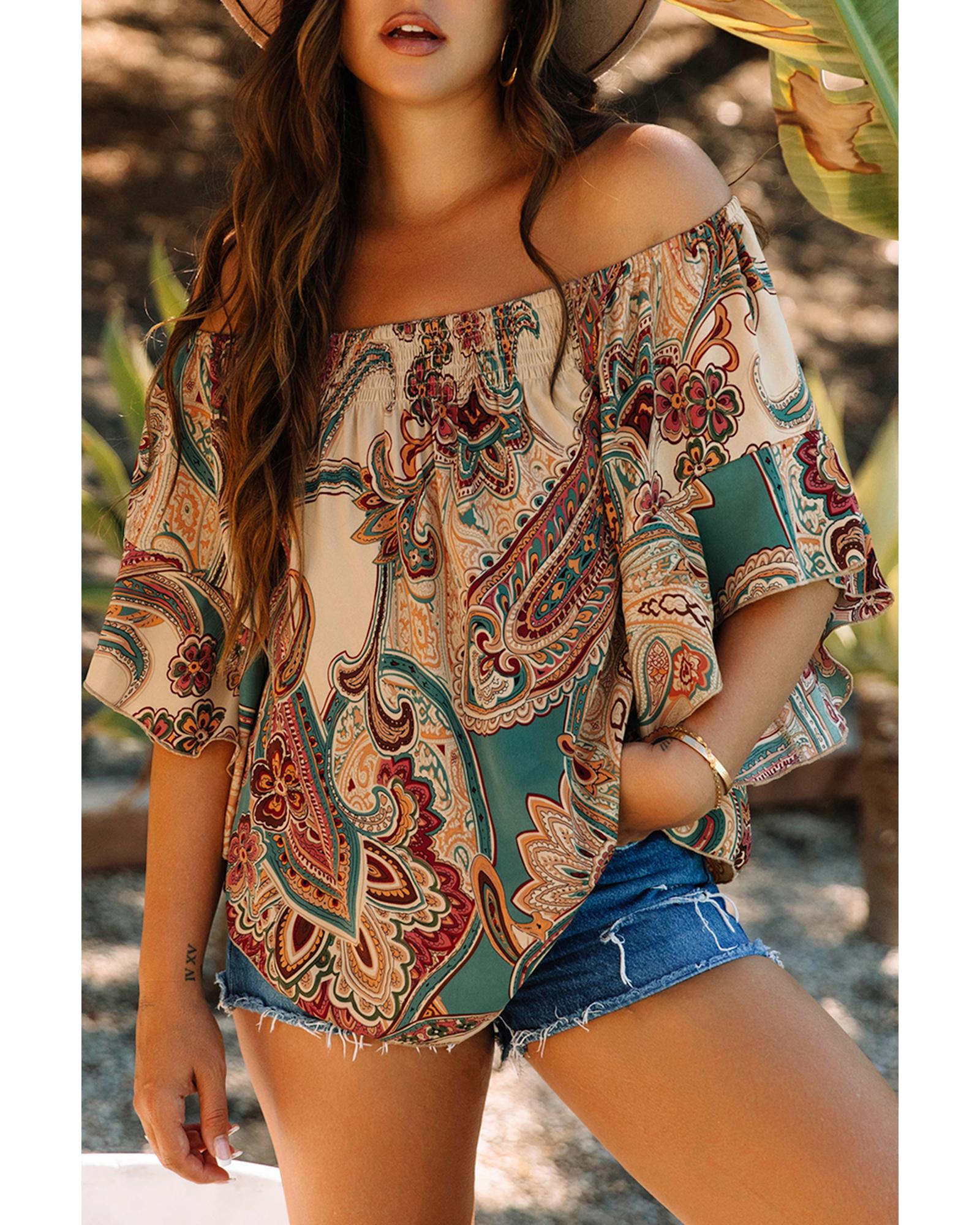 Apricot Paisley Printed Shirred Off Shoulder Ruffled Draped Sleeve Blouse – L