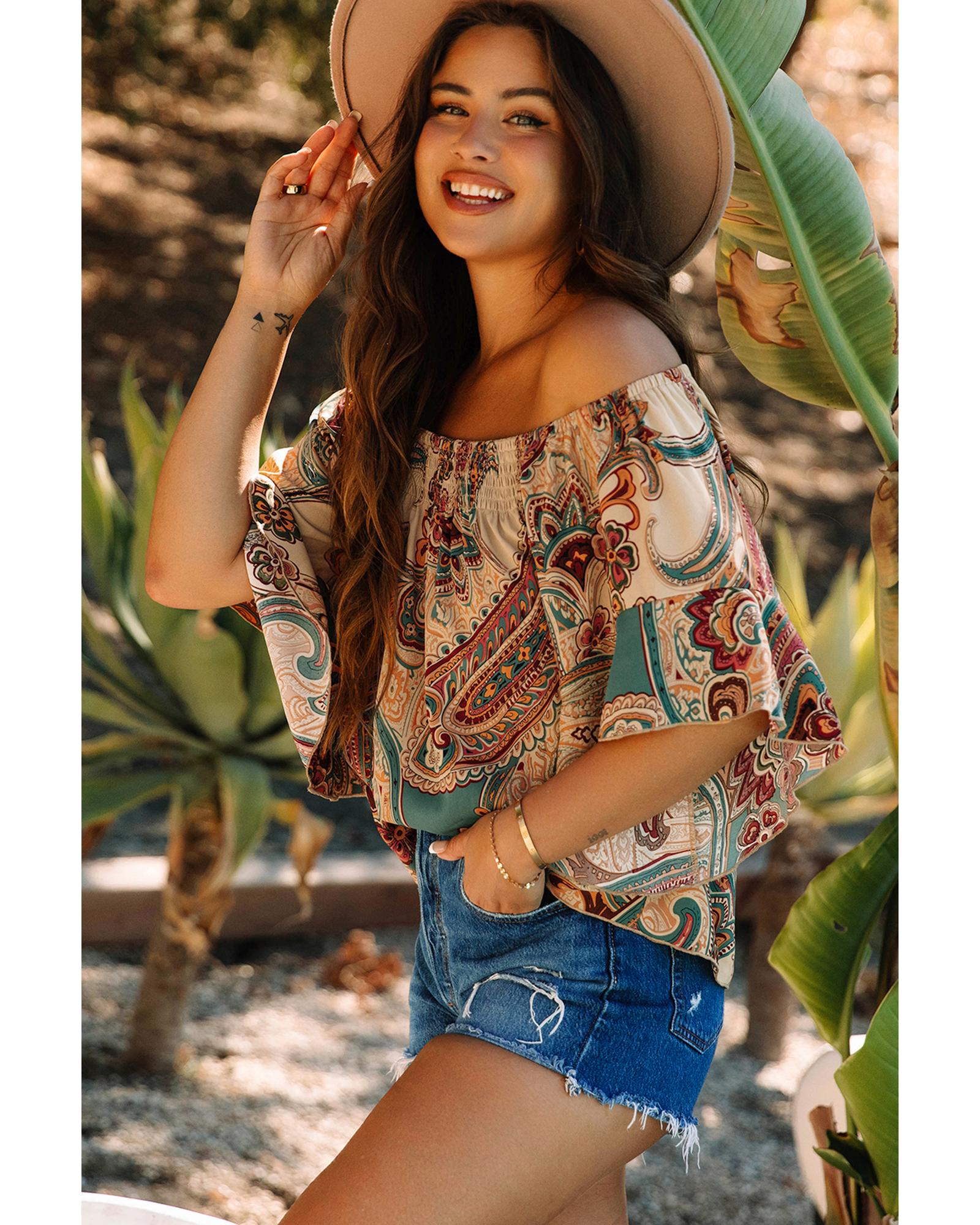 Apricot Paisley Printed Shirred Off Shoulder Ruffled Draped Sleeve Blouse – M