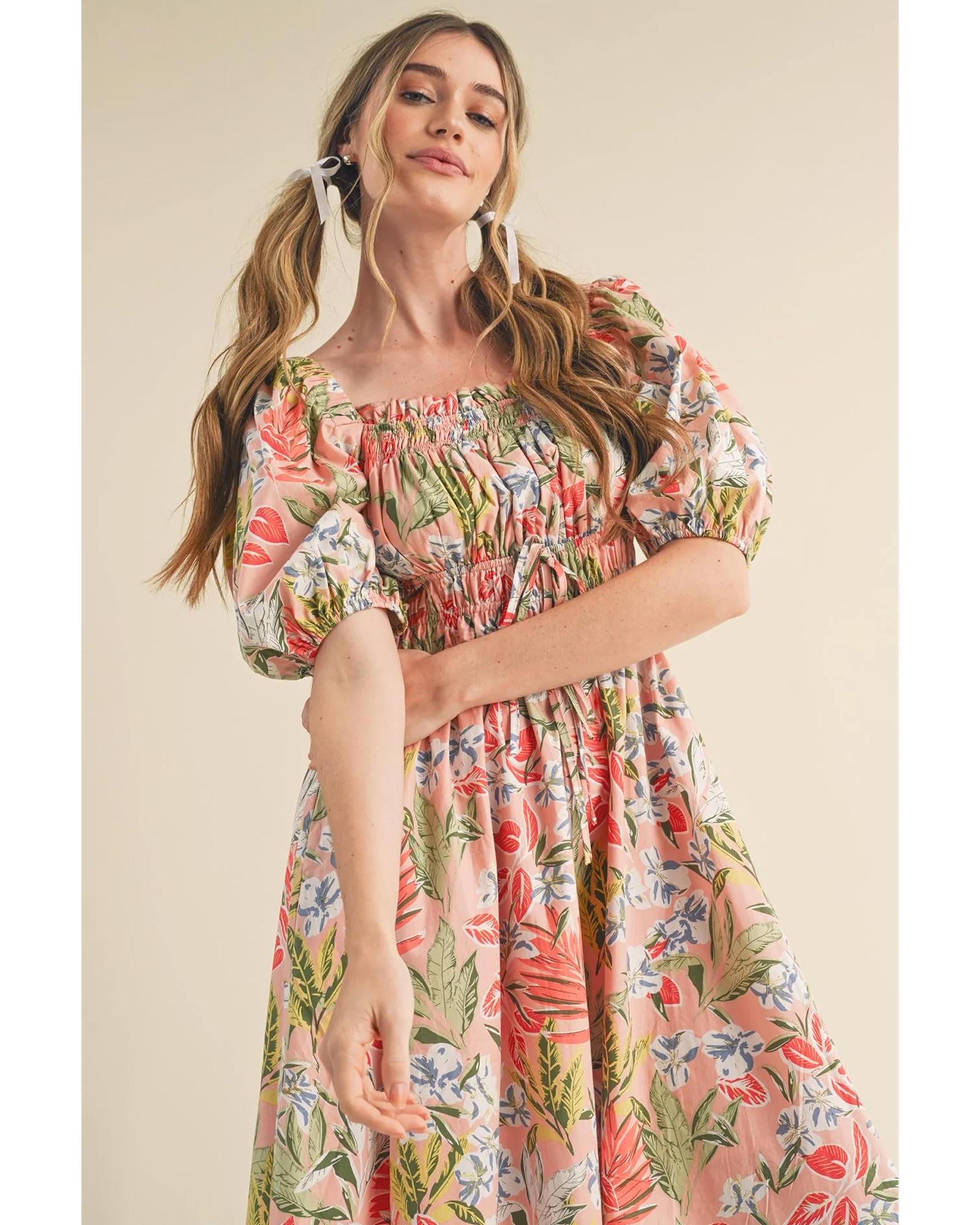 - Apricot Pink Floral Smocked Bust Bubble Short Sleeve Maxi Dress