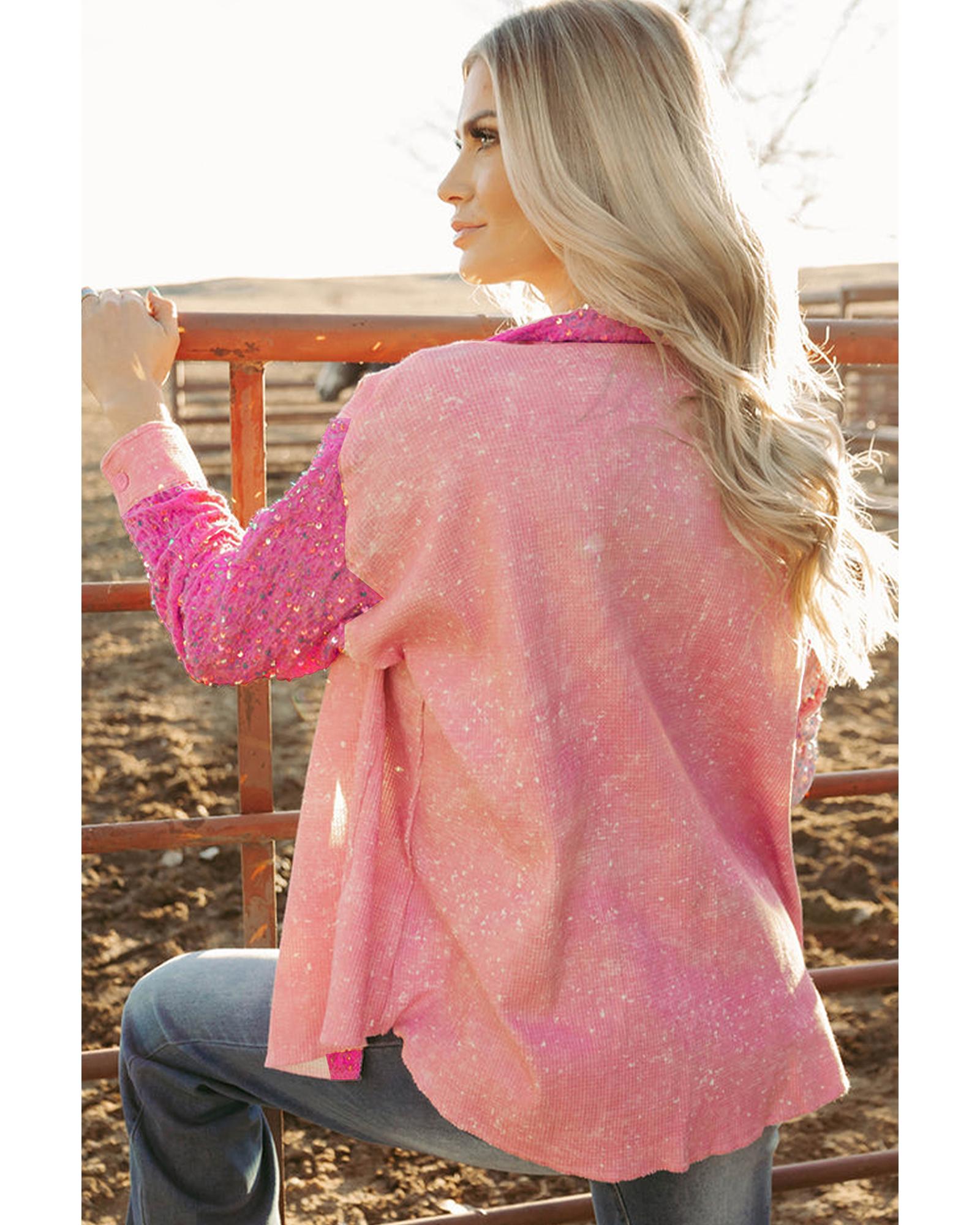 Apricot Pink Mineral Wash Sequin Patchwork Flap Pocket Shacket – M