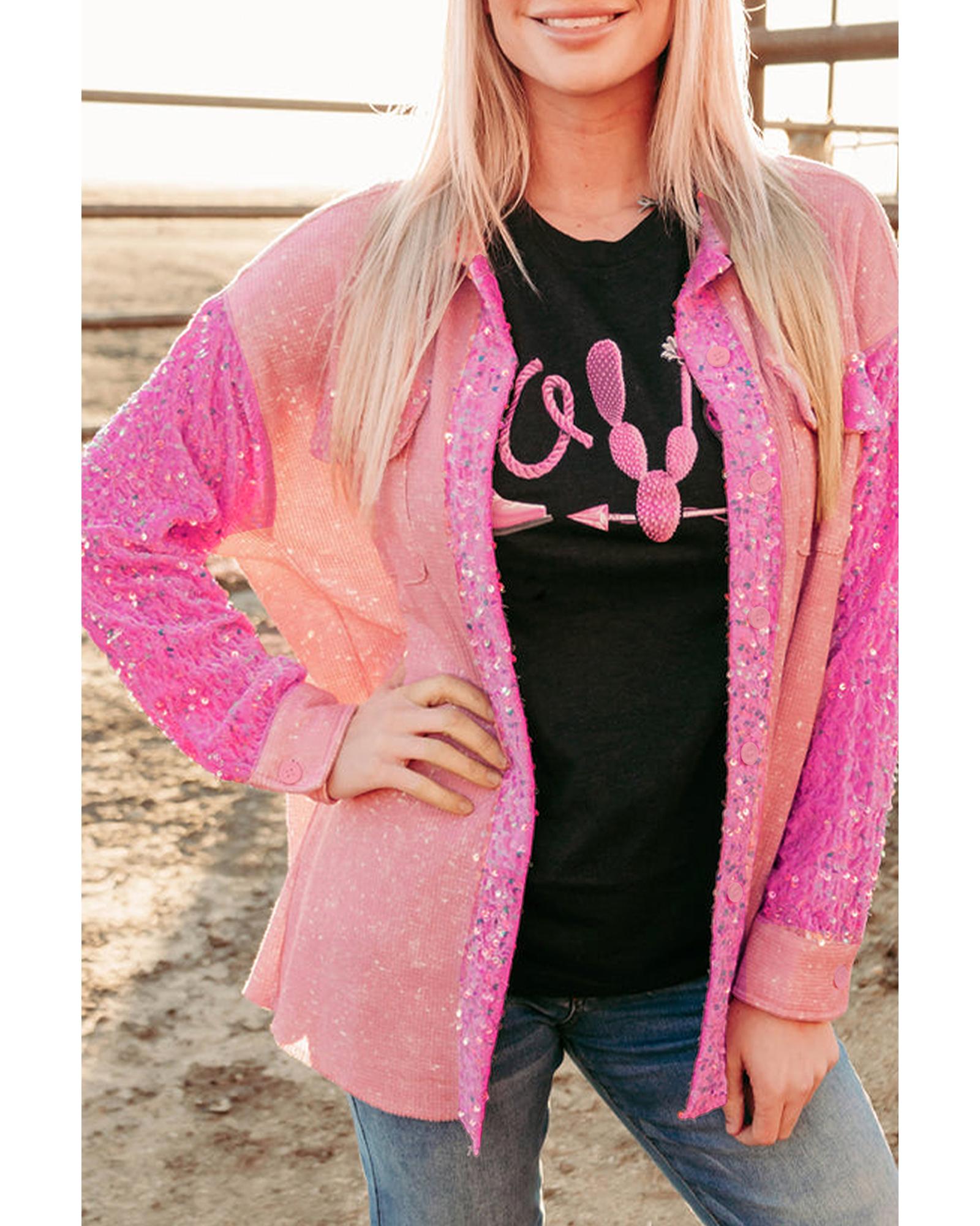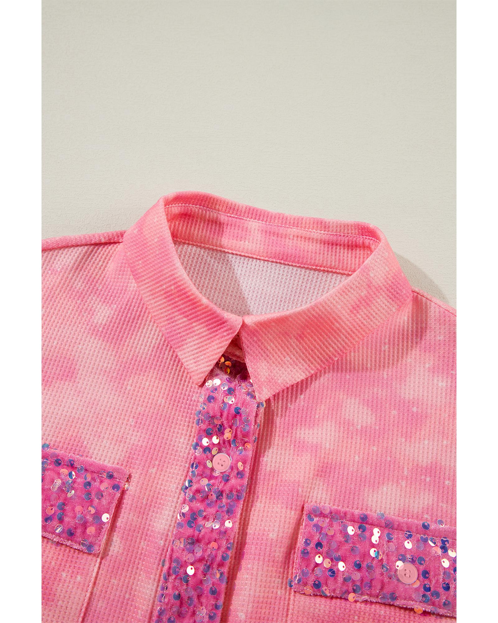 Apricot Pink Mineral Wash Sequin Patchwork Flap Pocket Shacket - S