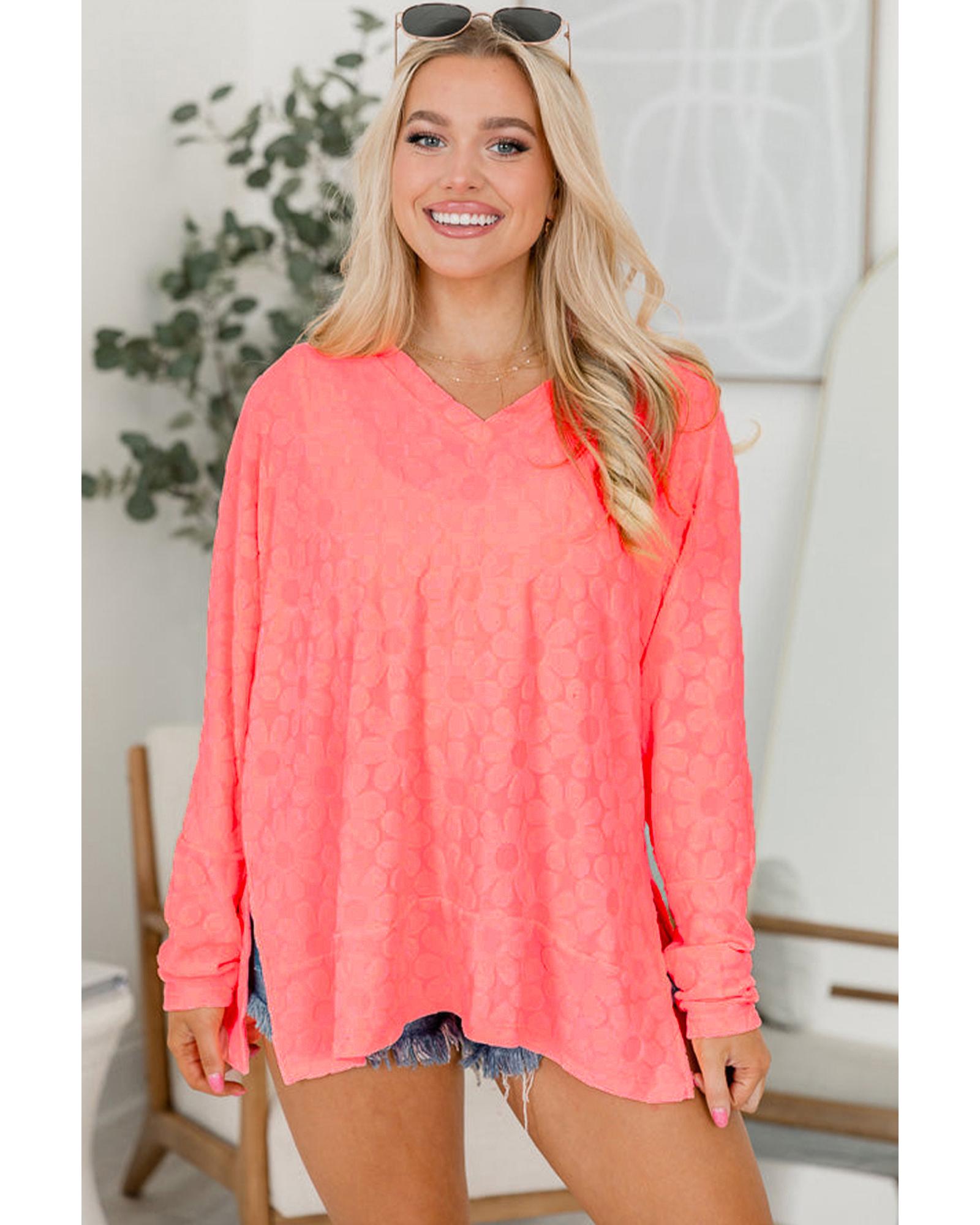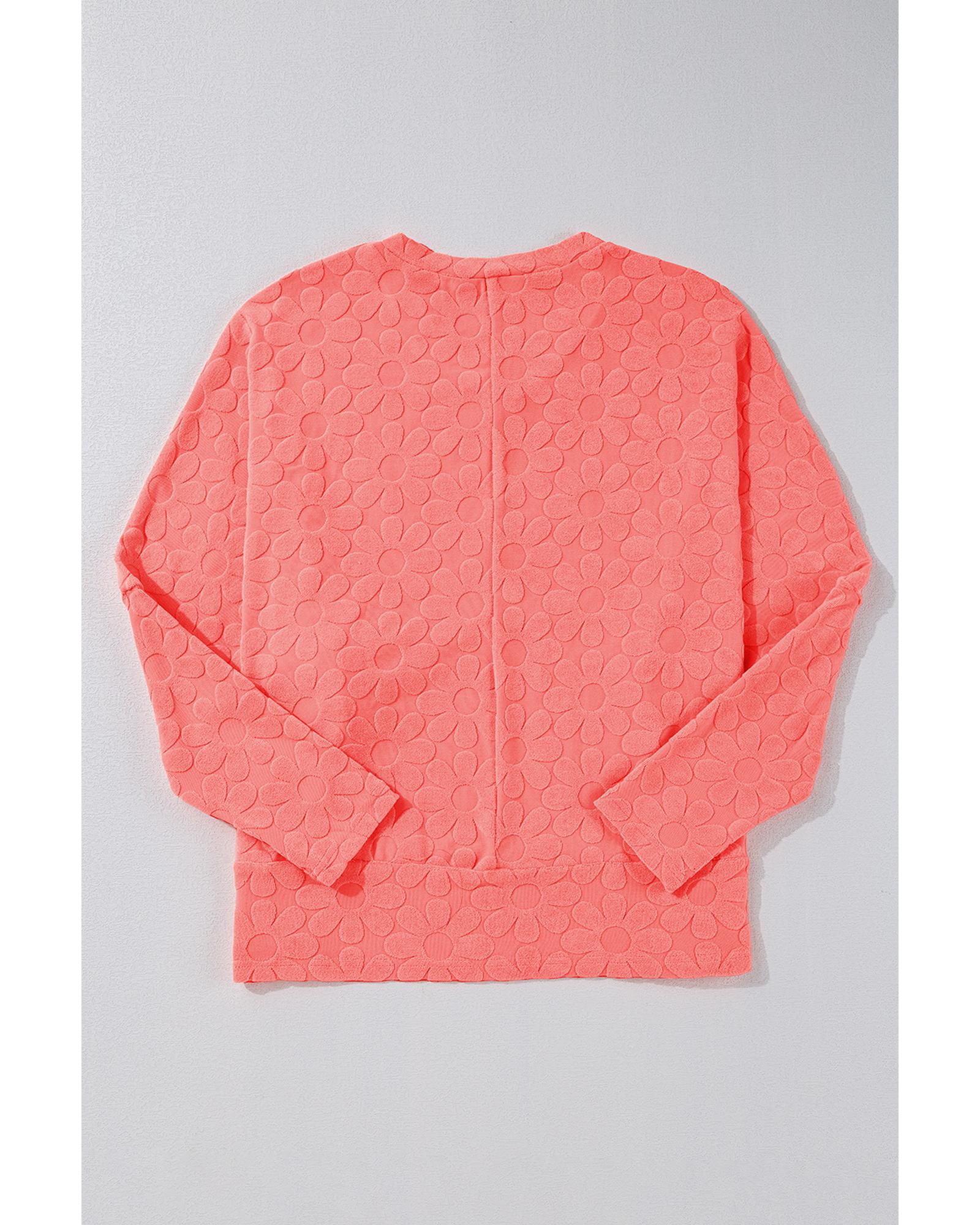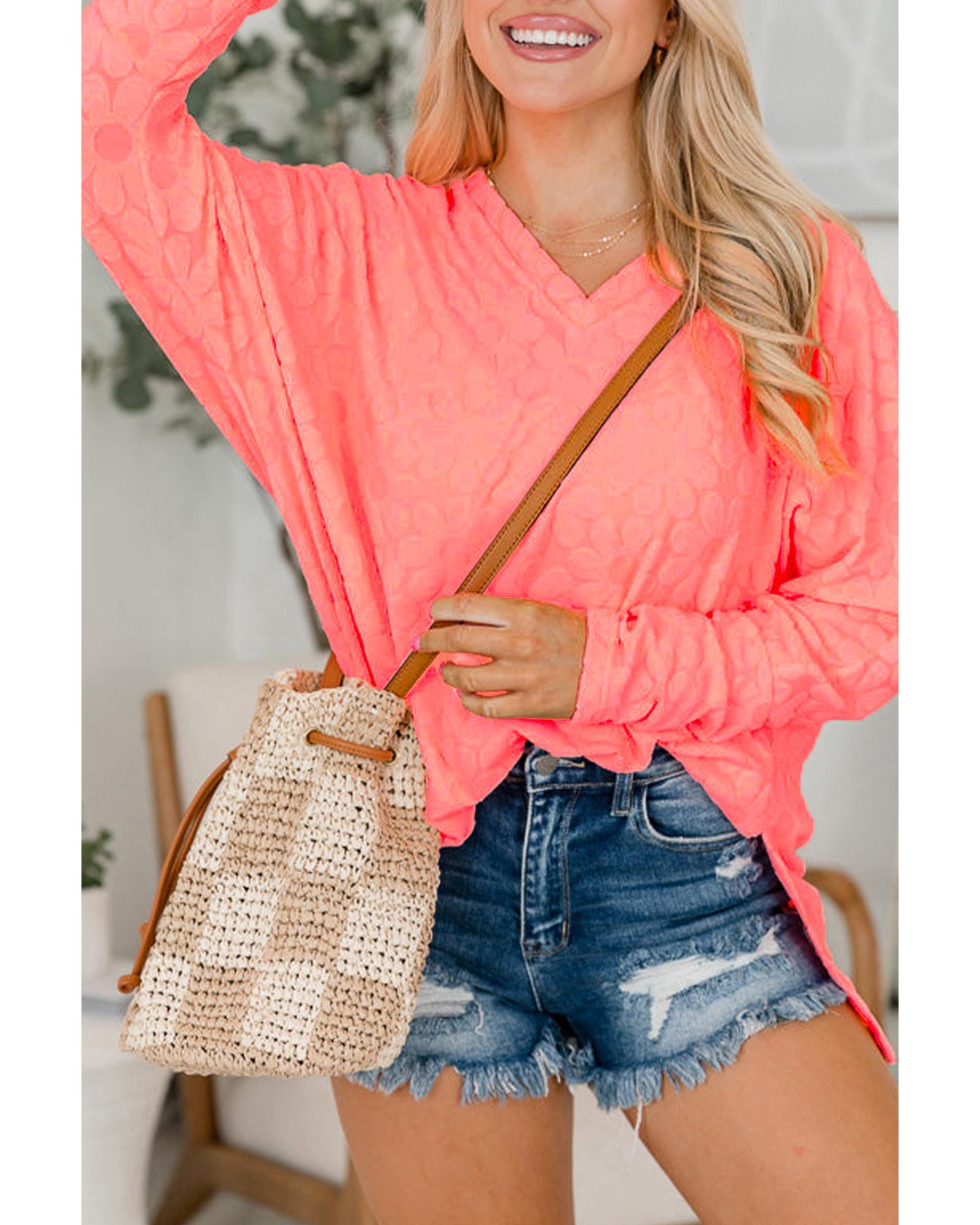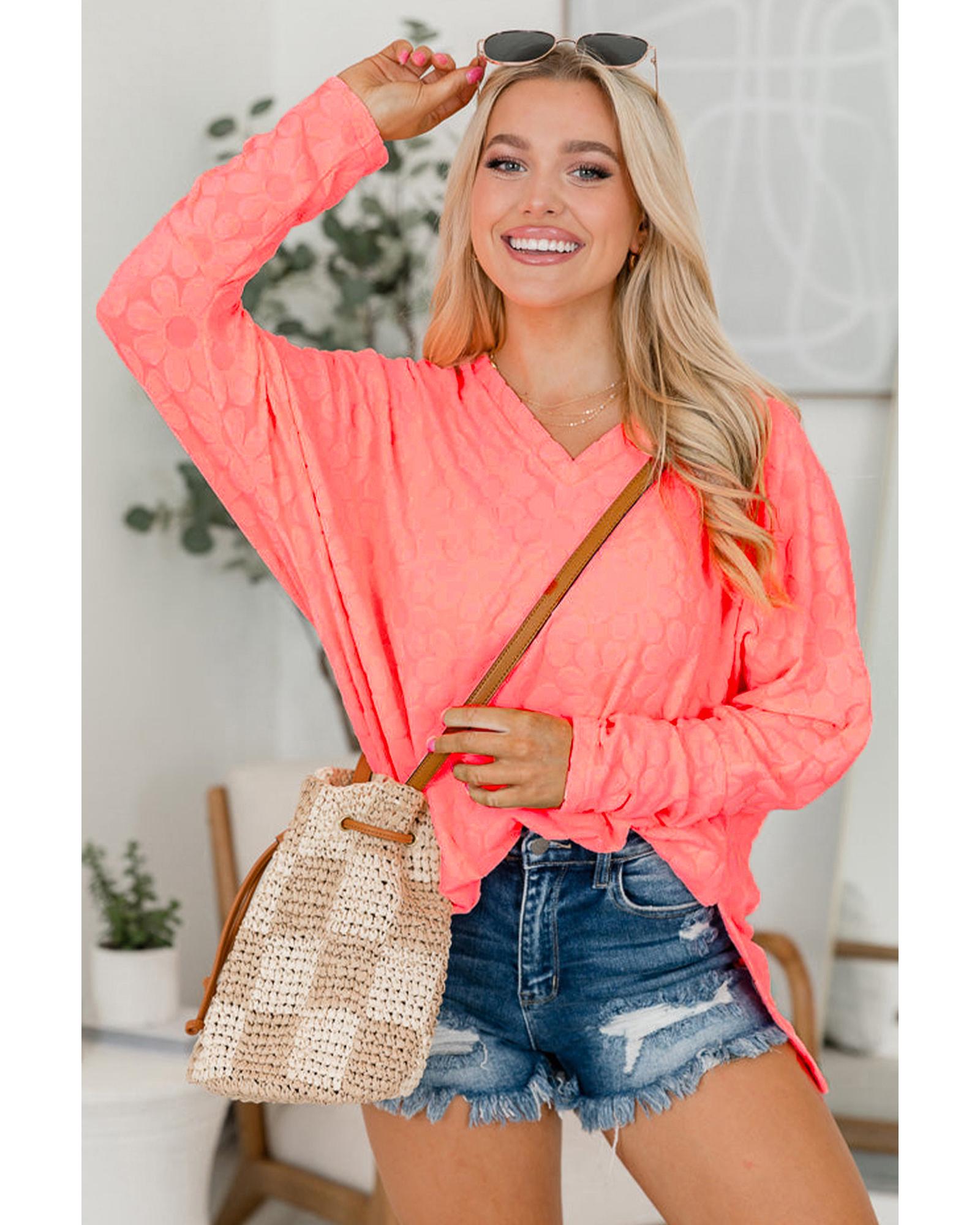 Apricot Pink Oversized Floral Jacquard V Neck Long Sleeve Top – M