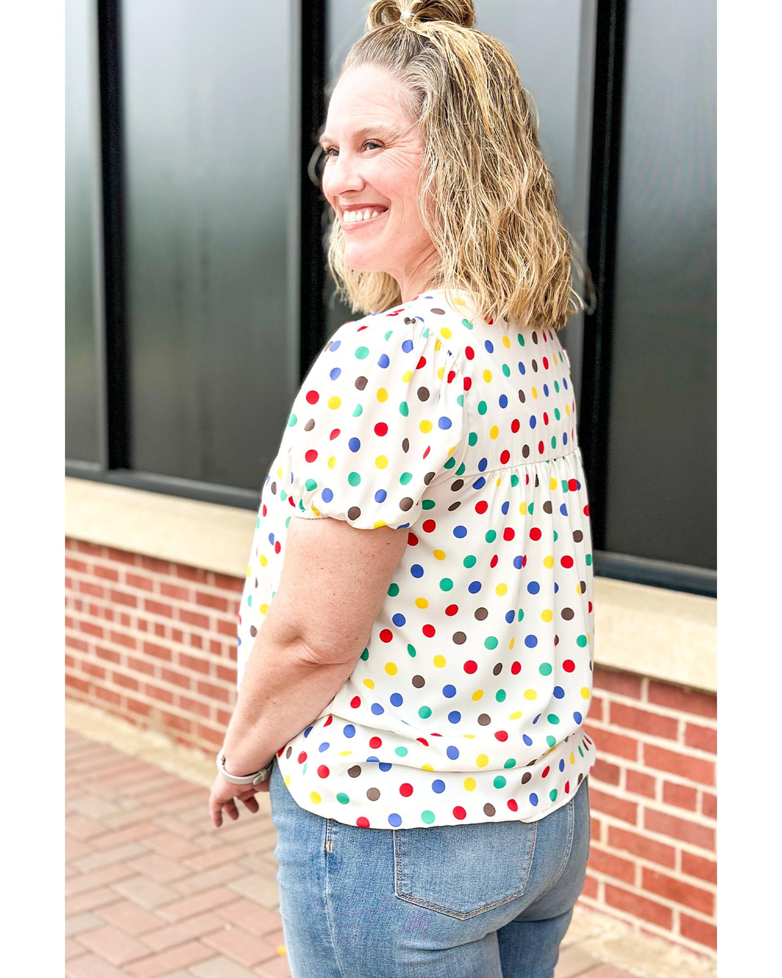 Apricot Plus Size Colorful Polka Dots Tie Neck Puff Sleeve Blouse – 4X