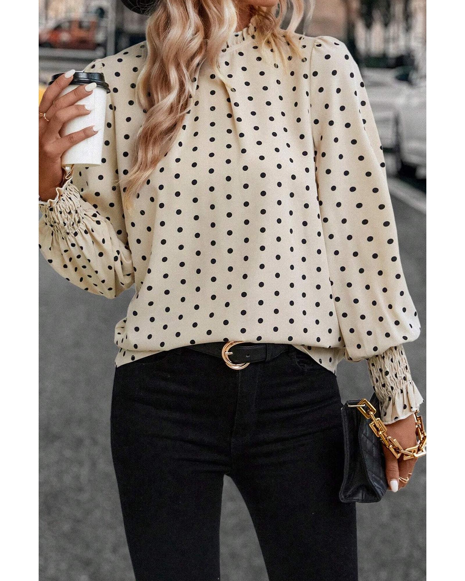 Apricot Polka Dot Print Frilled Collar Lantern Sleeve Blouse – S