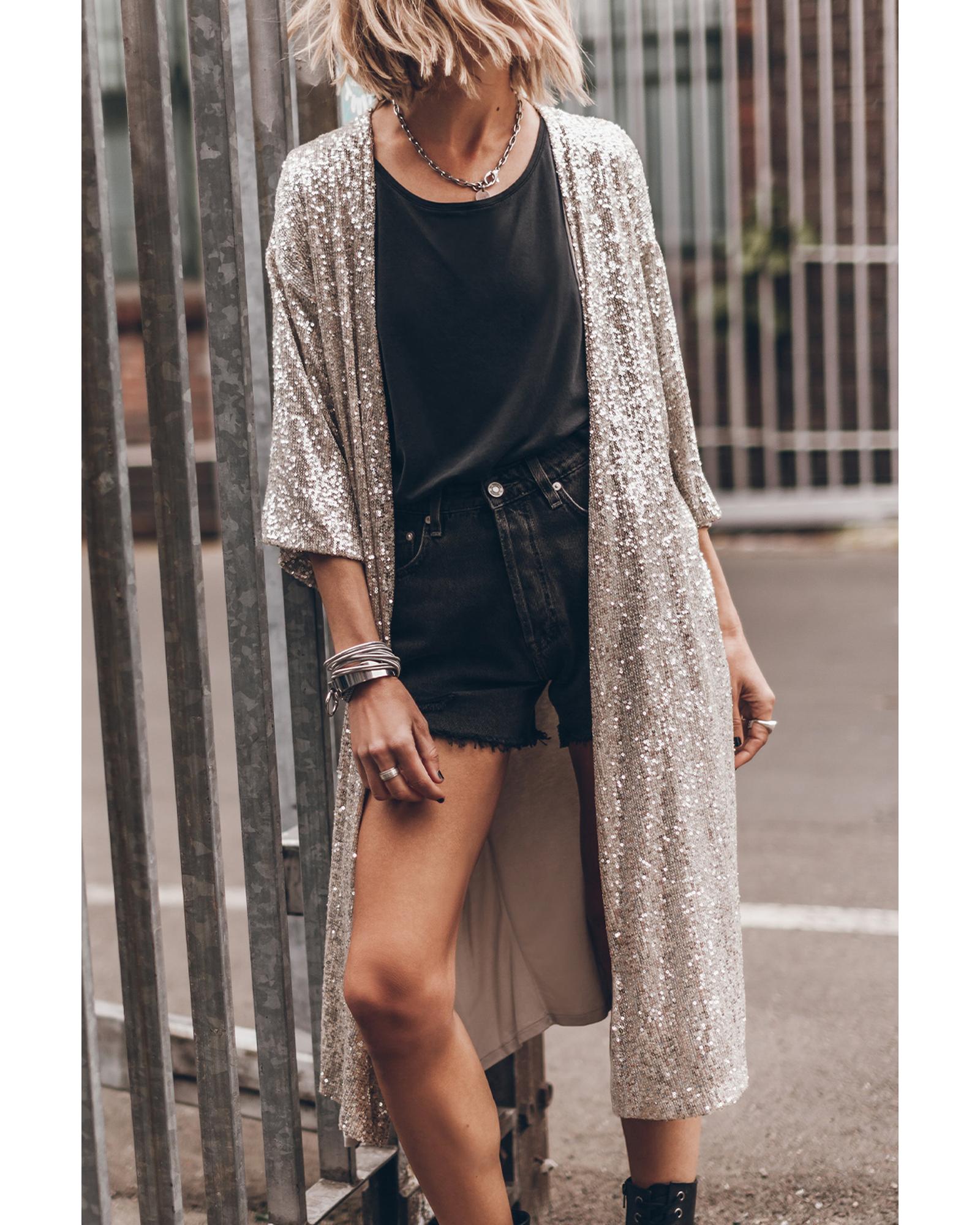 - Apricot Sequin 3/4 Sleeve Open Front Duster Kimono