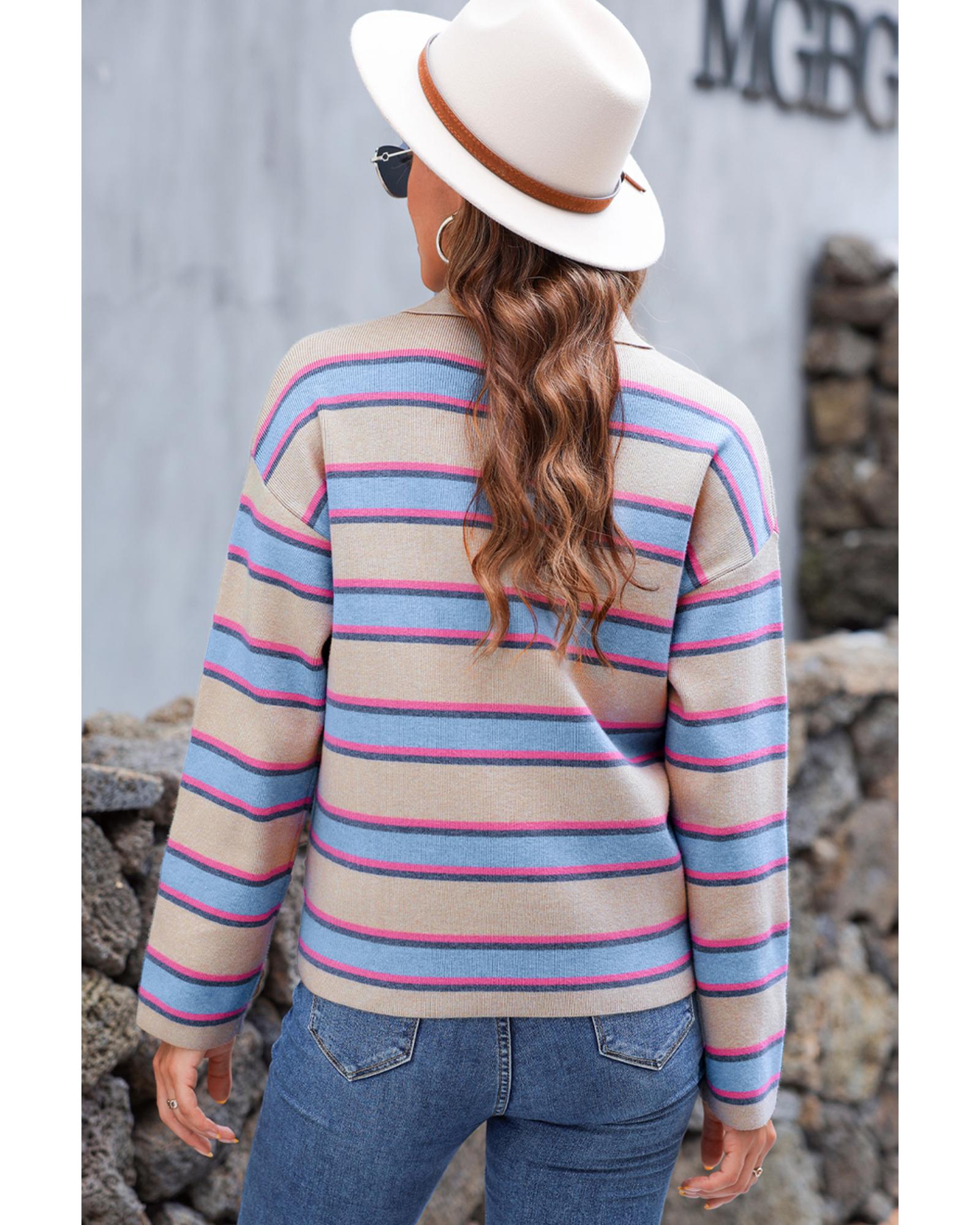 Apricot Stripe Collared V Neck Drop Shoulder Loose Sweater – M