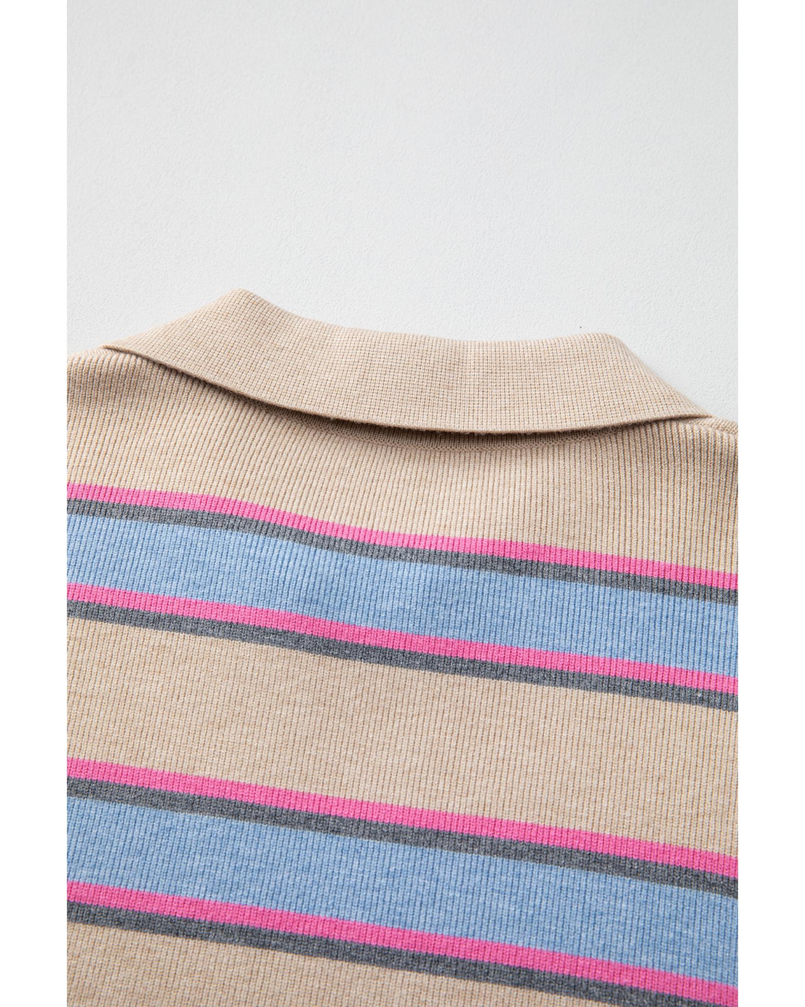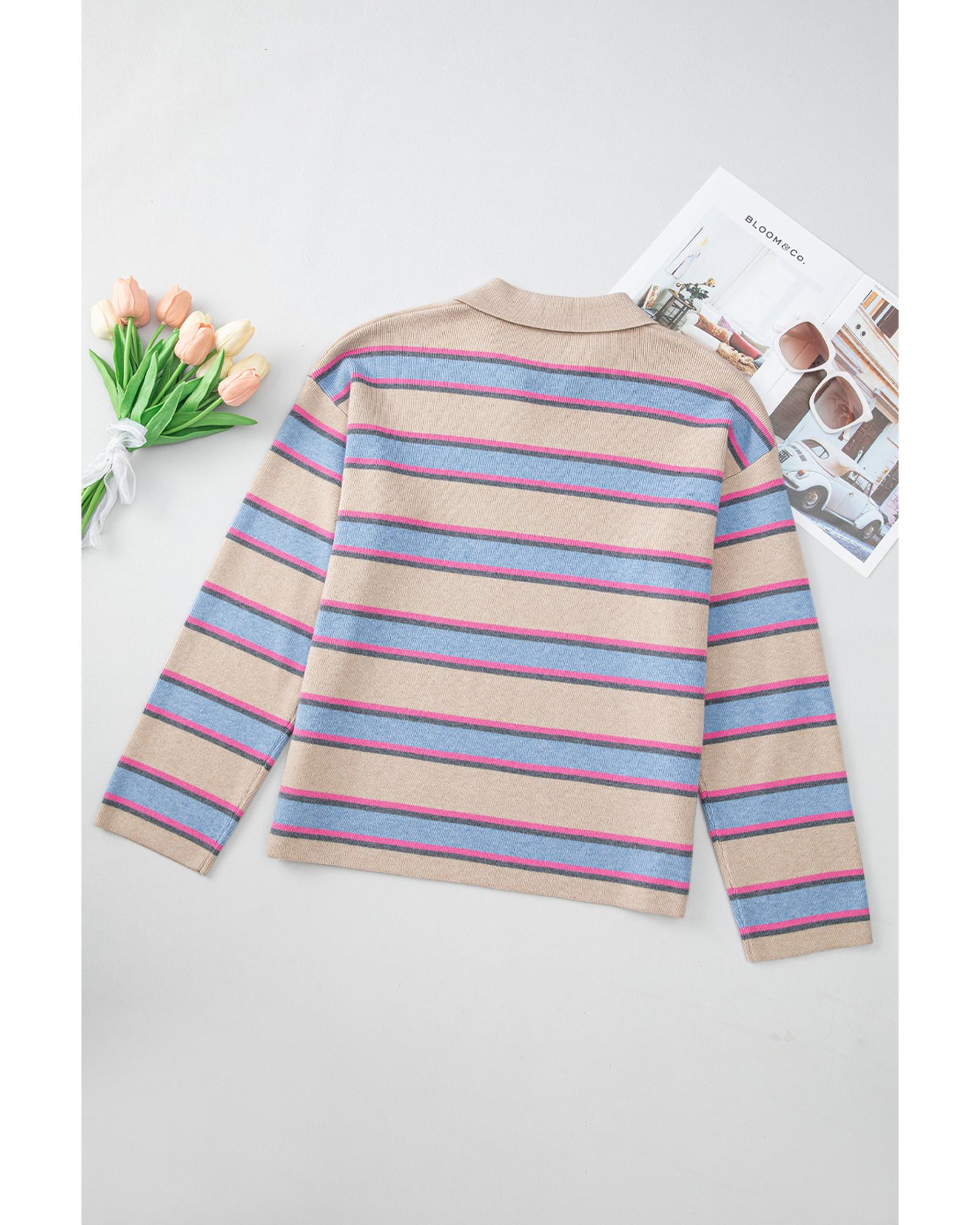 Apricot Stripe Collared V Neck Drop Shoulder Loose Sweater – XL