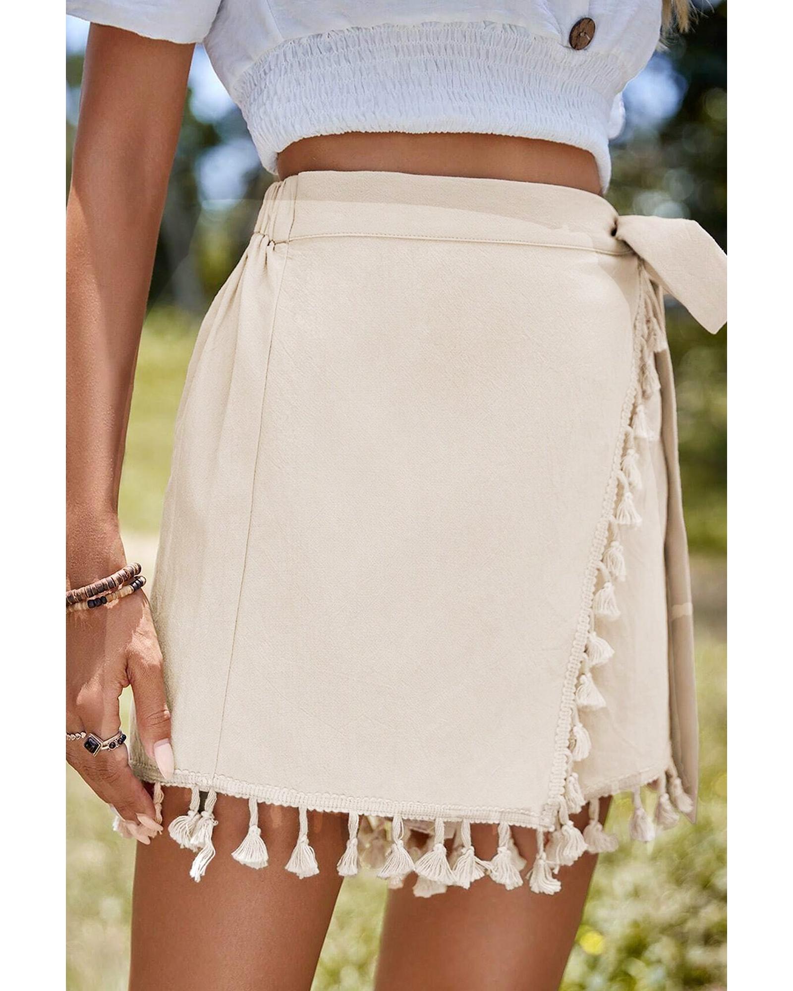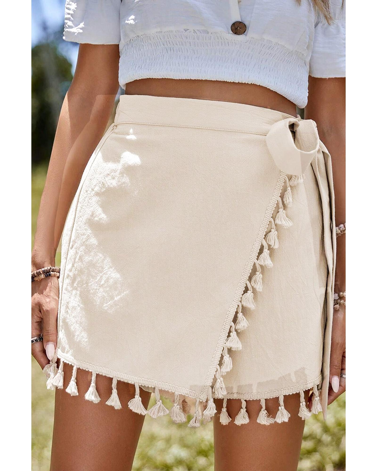 - Apricot Tassel Trim Wrap Knot Side Bohemian Style Mini Skort