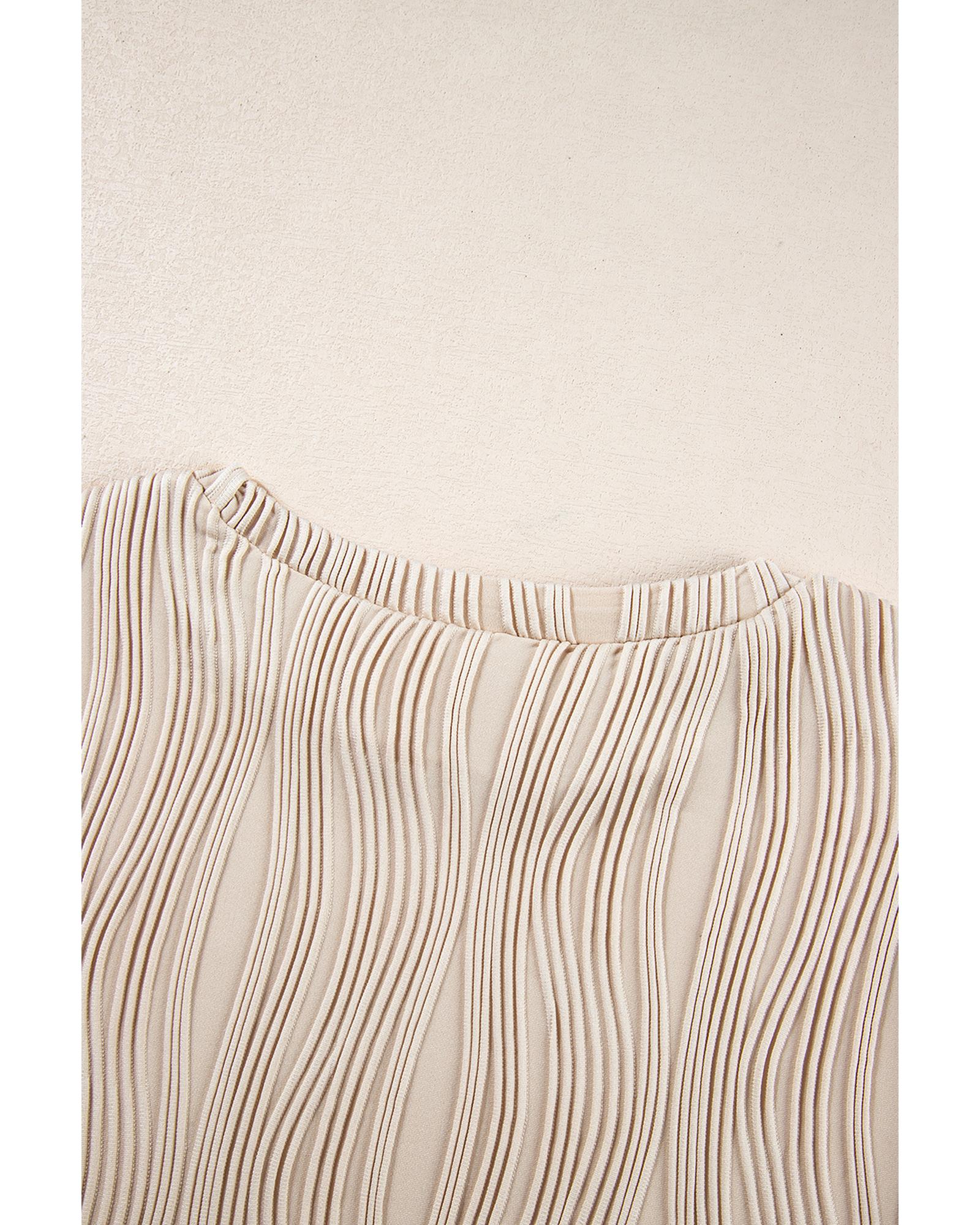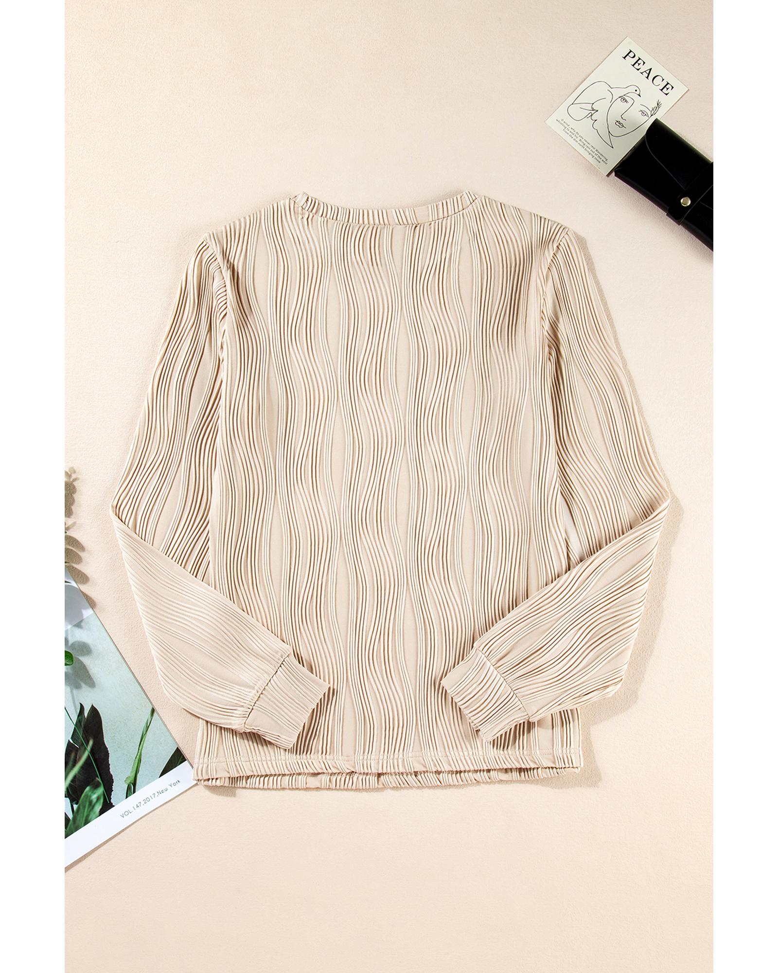 - Apricot Textured Wavy Round Neck Long Sleeve Top