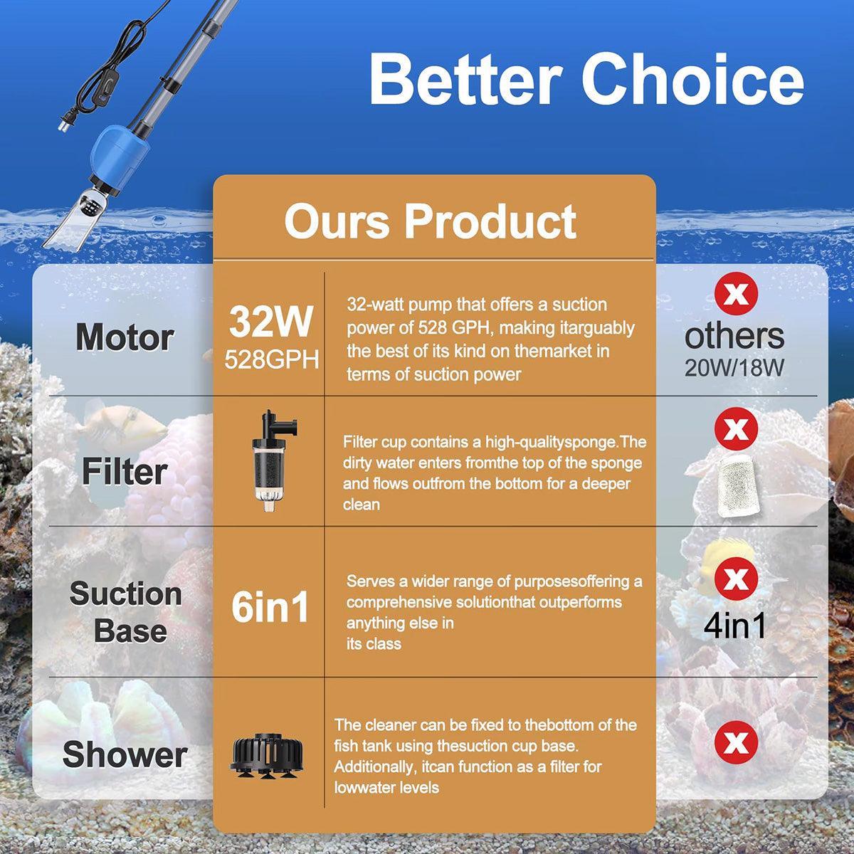 6-in-1 Functionality: Offers a comprehensive cleaning solution, including gravel cleaning, water changing, waste removal, and more.