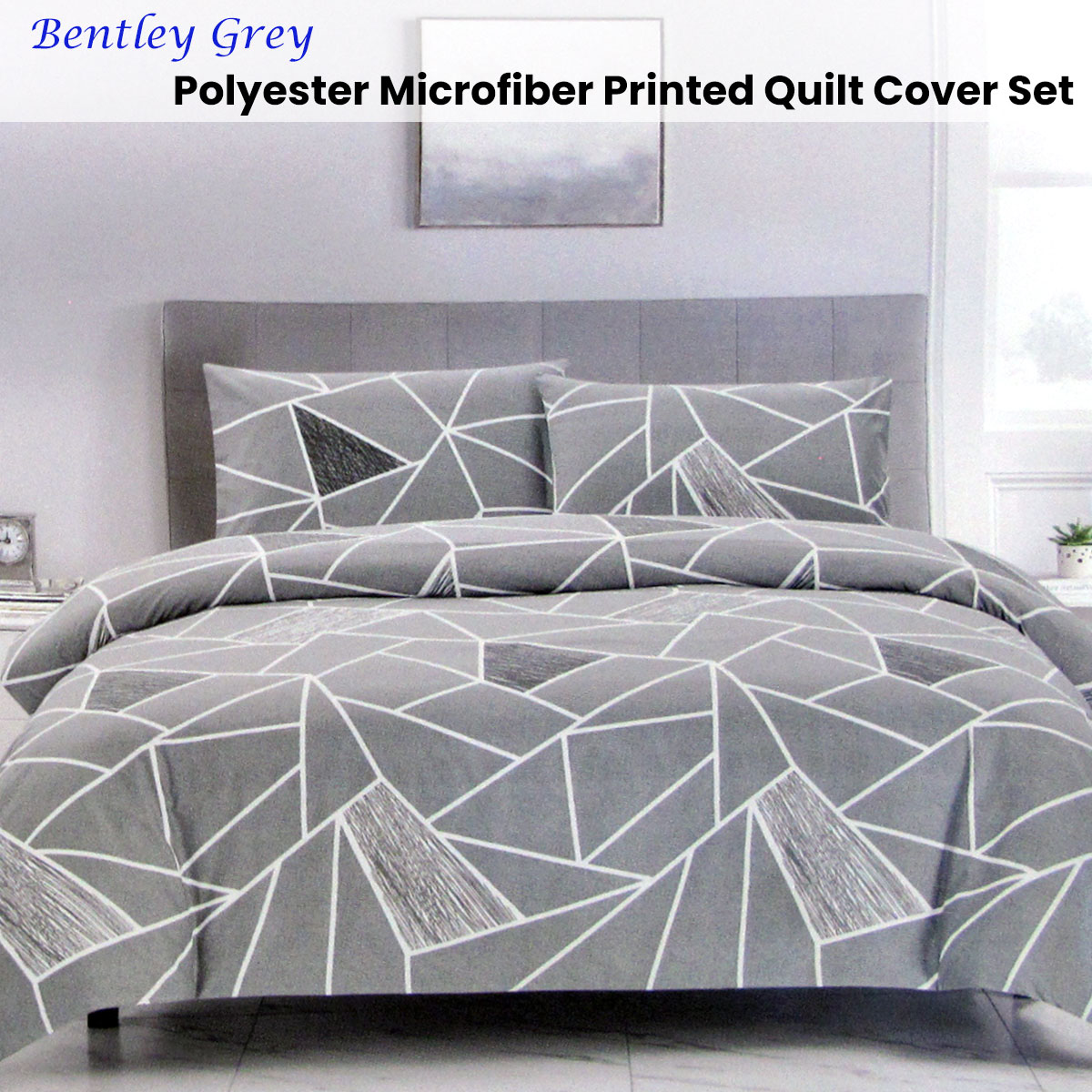 The Artex Bentley Grey Quilt Cover Set Geometric Pattern Reversible Printed Microfiber Polyester adds a modern touch to any bedroom with its sleek geometric design. Made from soft and durable polyester fabric, it ensures comfort and easy maintenance. The white, grey, and charcoal tones combined with sharp, angular patterns give the set a contemporary edge, making it a great choice for minimalist or modern decor themes. Approx 90gsm polyester fabric, zipper closure.