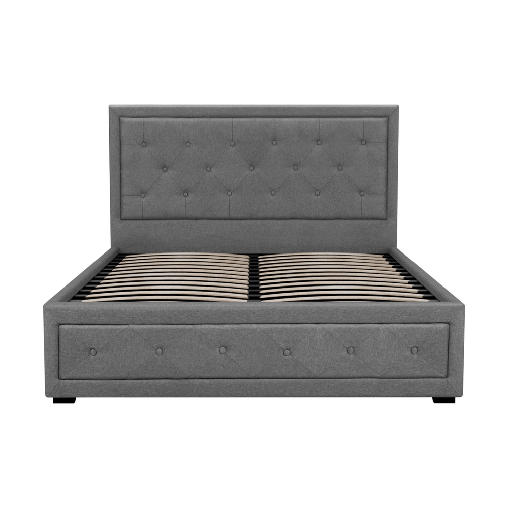 From the outside, our contemporary Artiss Tiyo Gas Lift Bed Frame looks absolutely plush. The premium faux linen fabric tufted headboard and sides all exudes fine craftsmanship. But there is more to this luxurious bed frame than meets the eye. Lift up the frame and you will find acres of storage space under the wooden arched slat base. The gas lift system and hand strap enable you to effortlessly lift the bed to store all your seasonal beddings and linen such as extra quilts, pillows and comforters and more. The wooden arched slat base is also designed to flex appropriately so that it can better distribute the weight exerted on it. Overall, the bed frame is well-built with reinforced steel bars within its sturdy steel frame. Heavy-duty metal connectors keep the frame sturdy with additional central support from an adjustable centre support beam. Enjoy your wonderful sleep in more ways than one with our innovative Tiyo Gas Lift Bed Frame.
