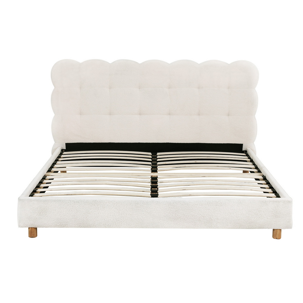 Artiss cloud headboard bed frame in white. Features boucle fabric upholstery and durable wood and metal construction. This platform base fits double mattresses. Includes wooden slats and metal legs for strength. Easy to assemble. Supports up to 300KG. Note: Actual colour may vary.