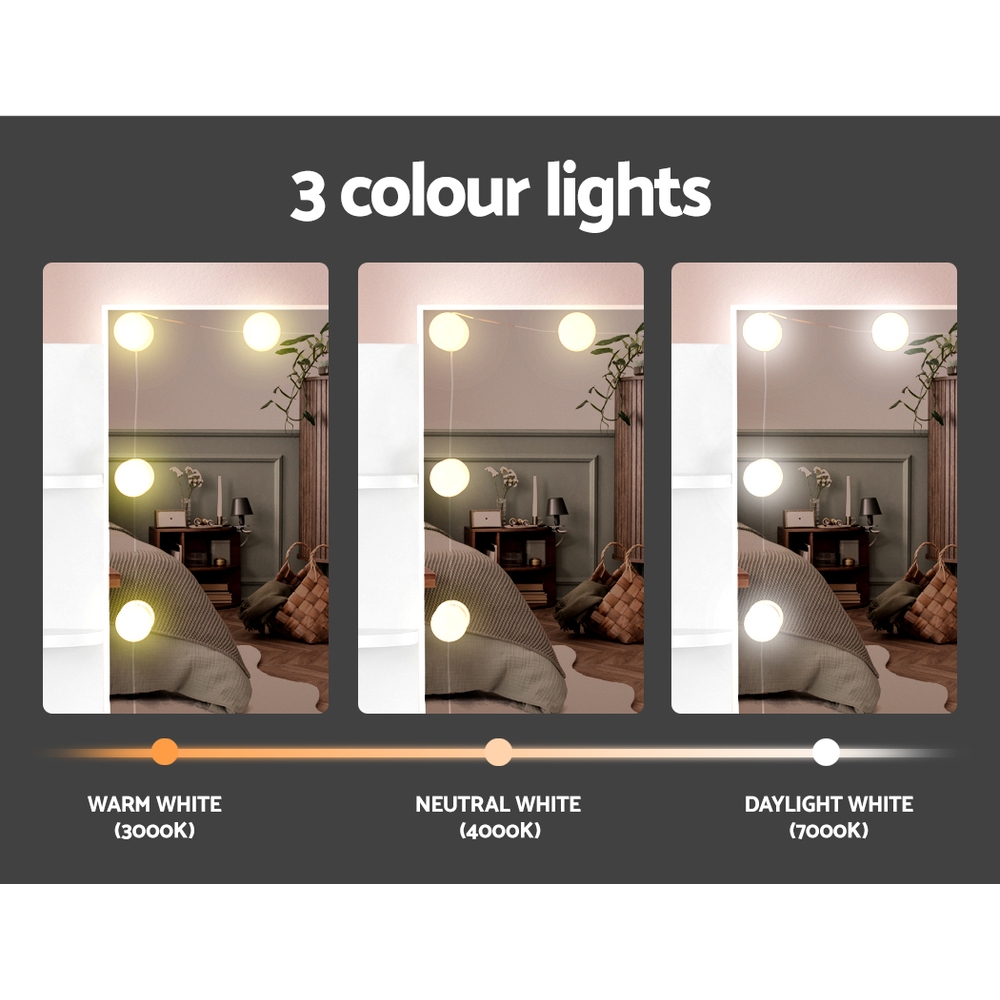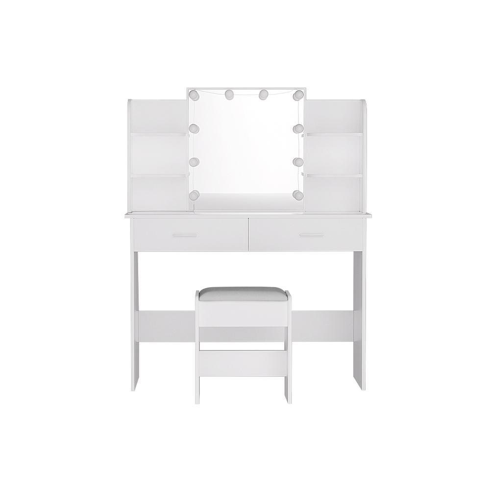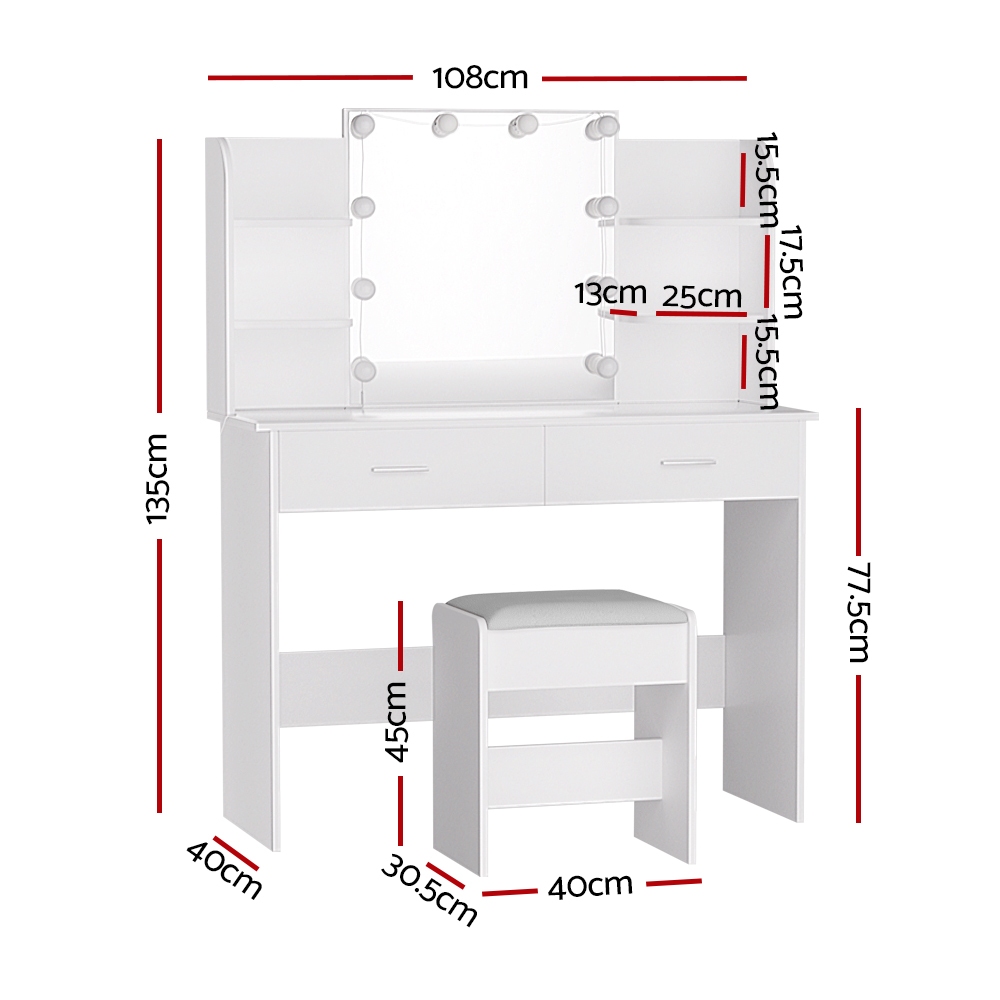 Feel like a star straight out of Hollywood with the Artiss Dulcea Dressing Table. Packed with generous storage and other convenient features, your new beauty routine will be a breeze. Made from quality MDF particleboard with a melamine finish, the table is built to last. The Hollywood-style makeup mirror is surrounded by bright LED bulbs for the perfect illumination. Choose from warm, neutral and daylight white light so you can always look stage-ready. The vanity features open shelves that you can use to display trinkets or beauty products. Two generous storage drawers with silver handles open smoothly on anti-rust runners, giving you instant access to your beauty essentials. A foam-padded PU leather stool allows you to sit comfortably while applying make-up or skincare and can be neatly tucked away when not in use. Easy to install and even easier to maintain, you’ll love getting ready for the day in front of your new Artiss Dulcea Dressing Table.