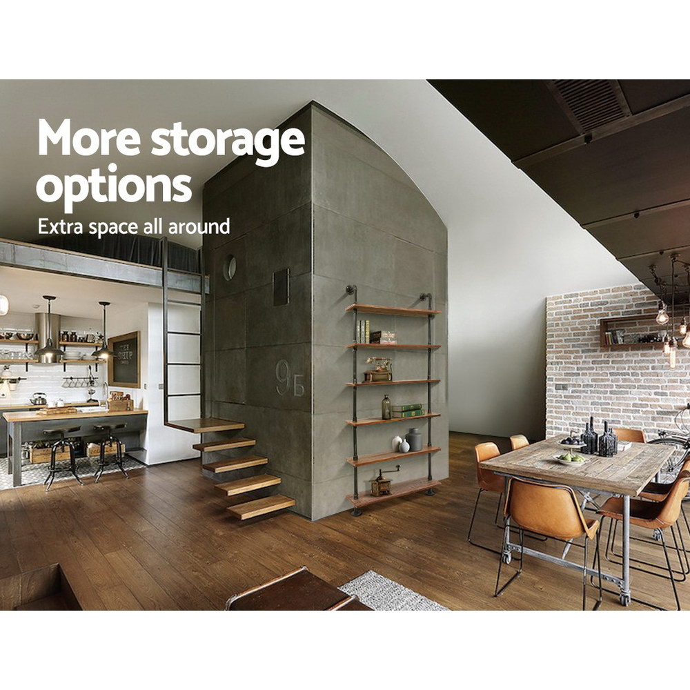 Featuring a rustic industrial 6 level pipe shelf that is perfect for home, office and café interior. Made from quality metal pipe and solid timber, the pipe shelf is one of a kind design. It is suitable for both indoor and outdoor applications.