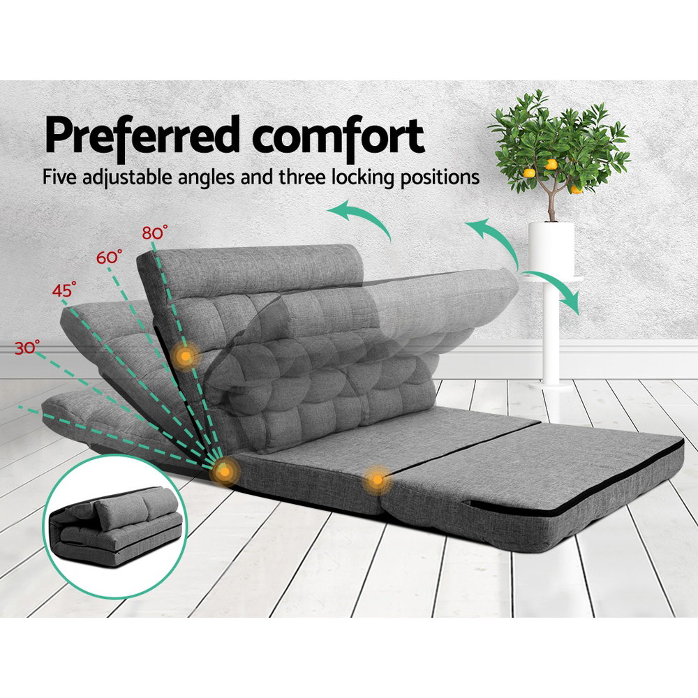 Get comfortable with the Artiss Lounge Sofa Bed for all your leisure activities. With five adjustable angle and three locking positions , the lounge sofa bed lets you sit and rest in your preferred position with absolute ease. Read a book watch TV and just chilling out, the lounge sofa bed is your definite go-to every time as a sofa, laid-back lounge or mattress. Made of heavy-duty steel and upholstered in a skin-soft faux linen fabric, the lounge sofa bed is generously padded with a high resilience foam that is durable and lasting. Not least, the lounge sofa bed can be separated into four pieces for easy storage. The zipped covers are also removal for hassle-free cleaning.