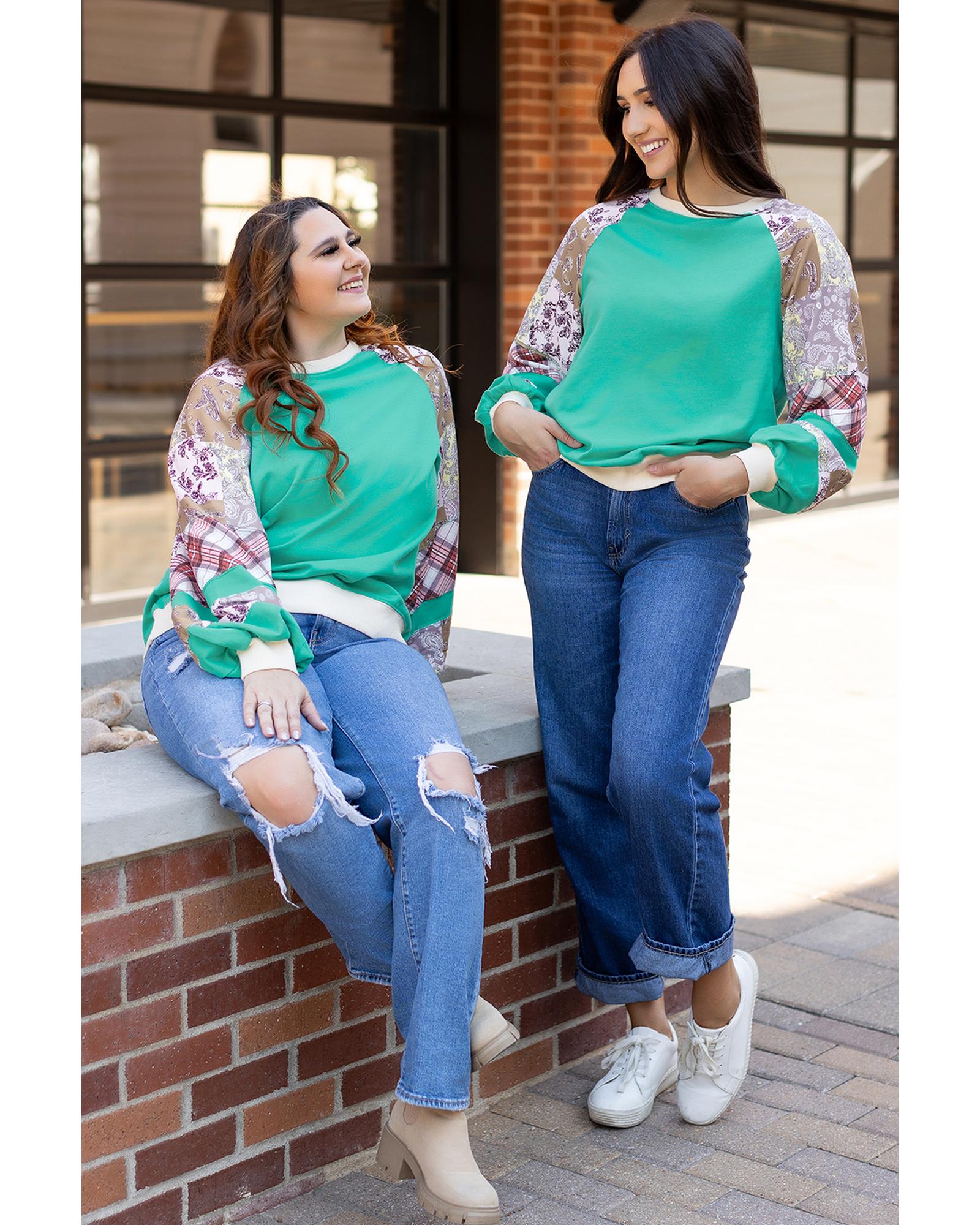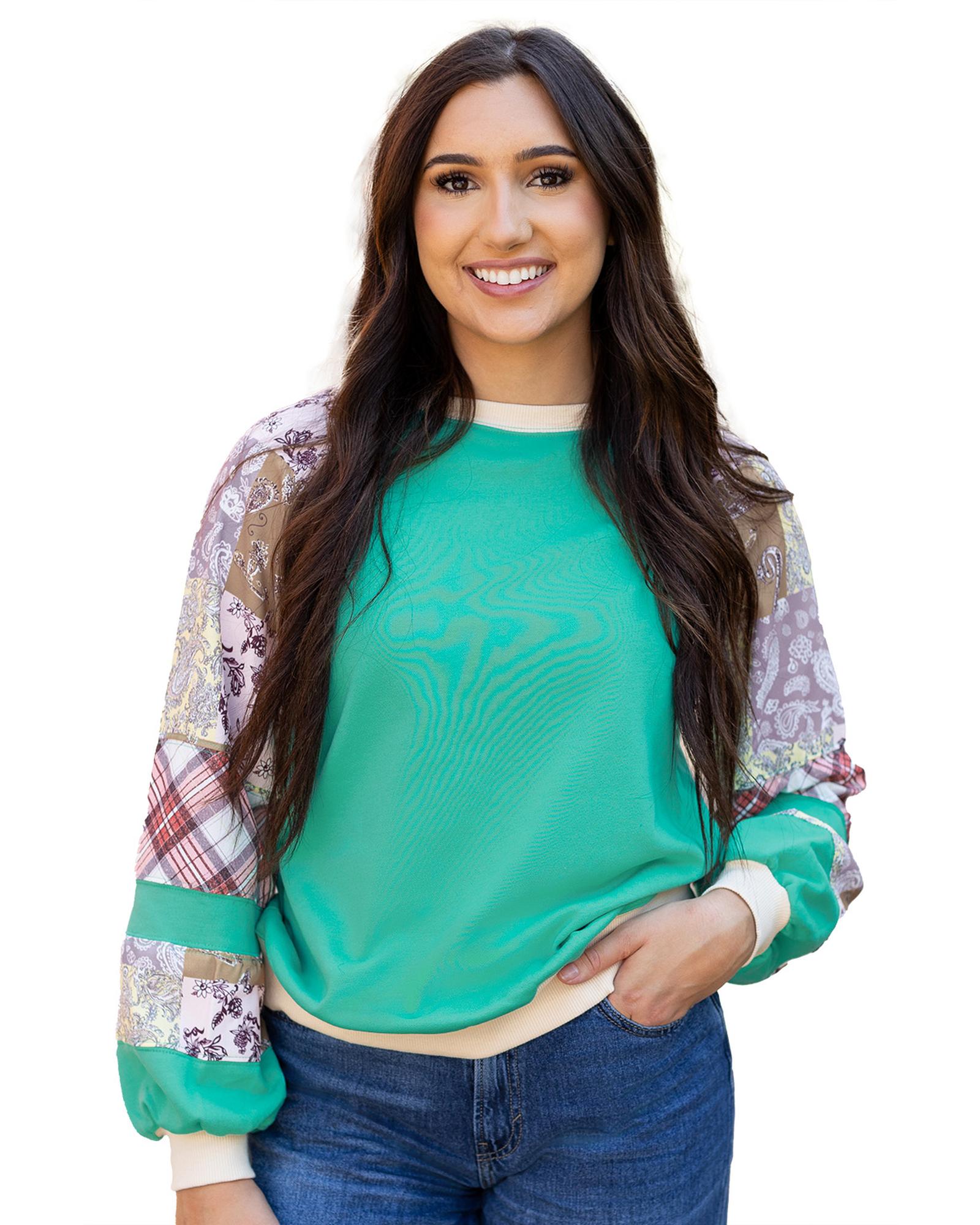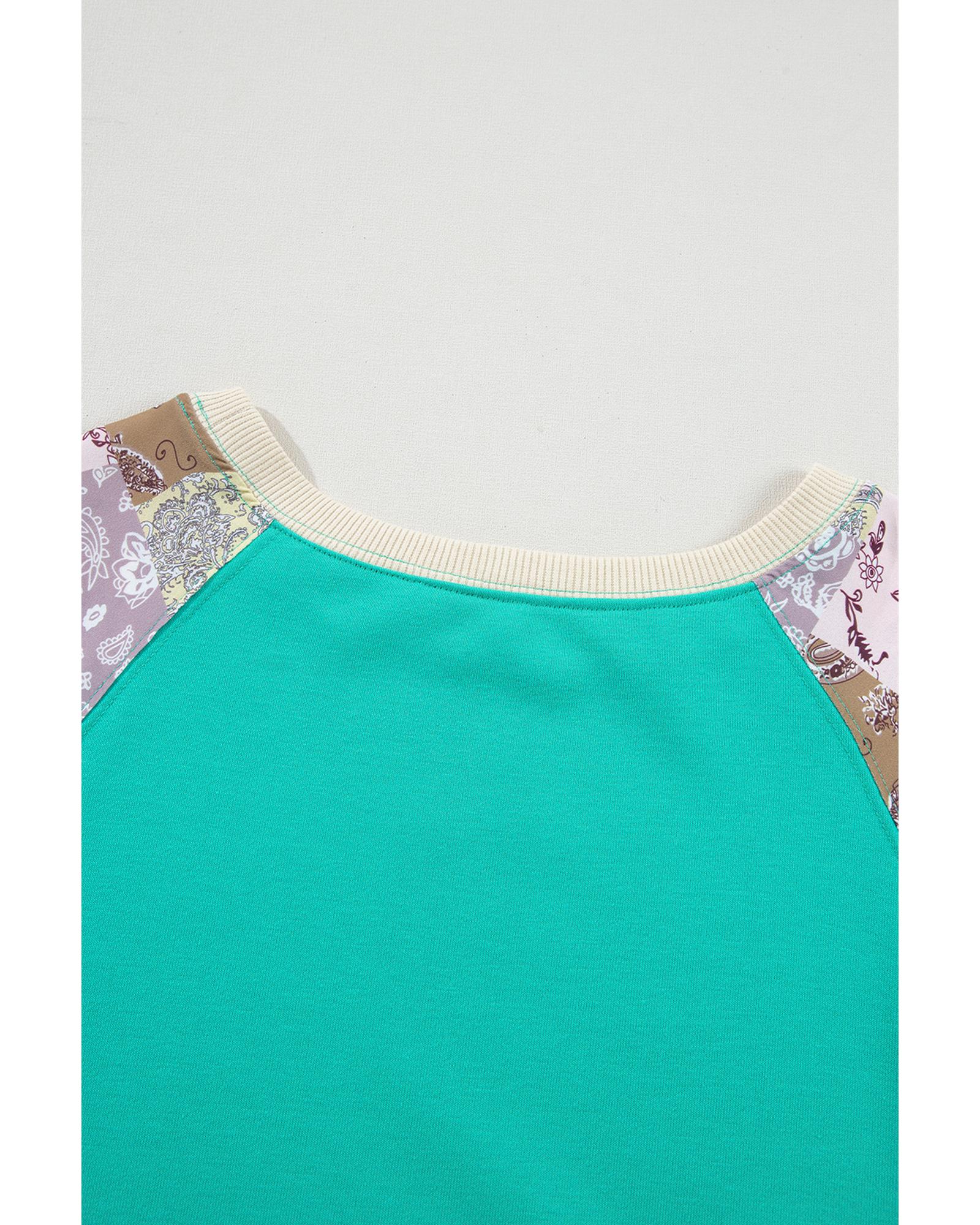 Aruba Blue Plaid Vintage Paisley Patchwork Long Sleeve Raglan Top – S