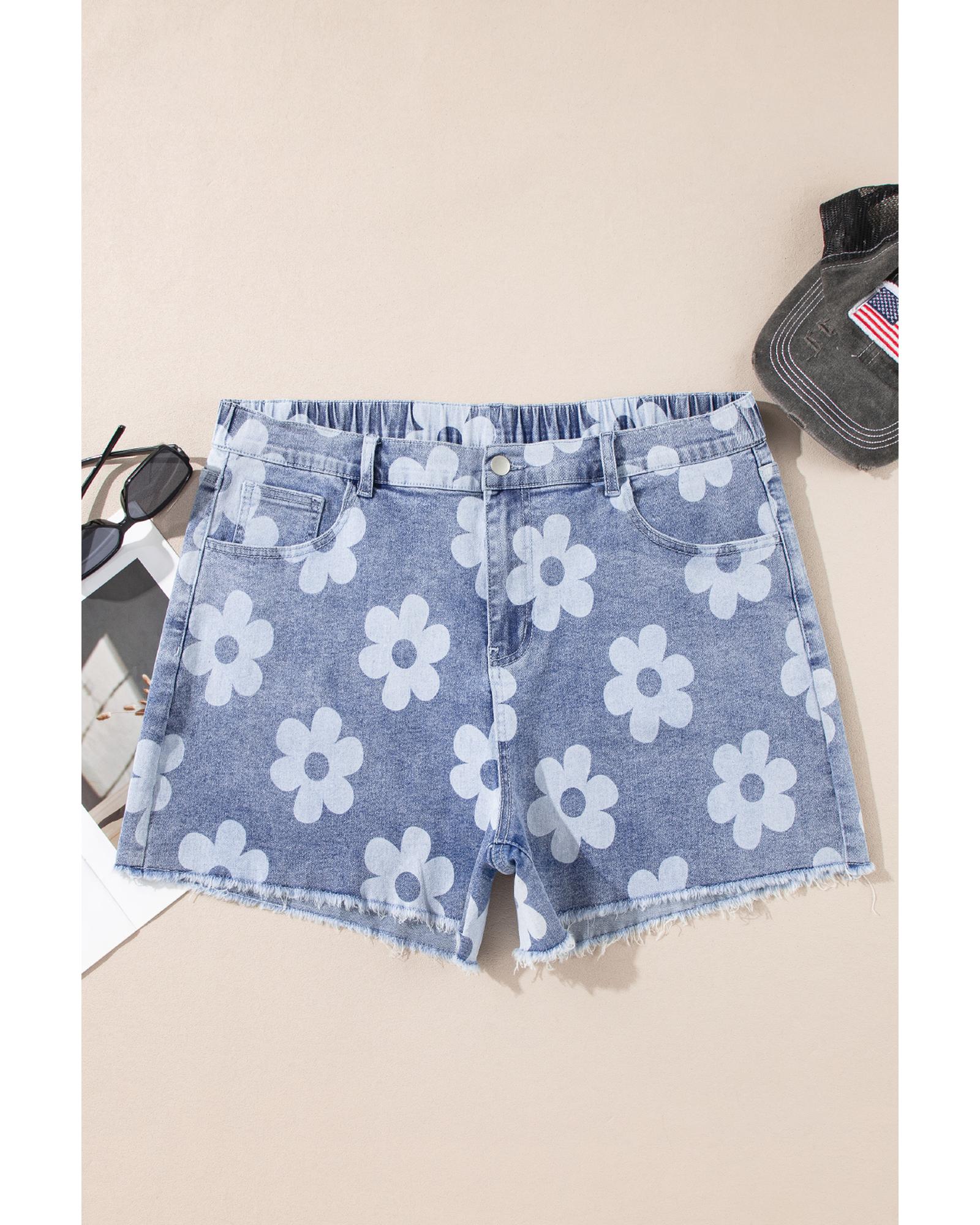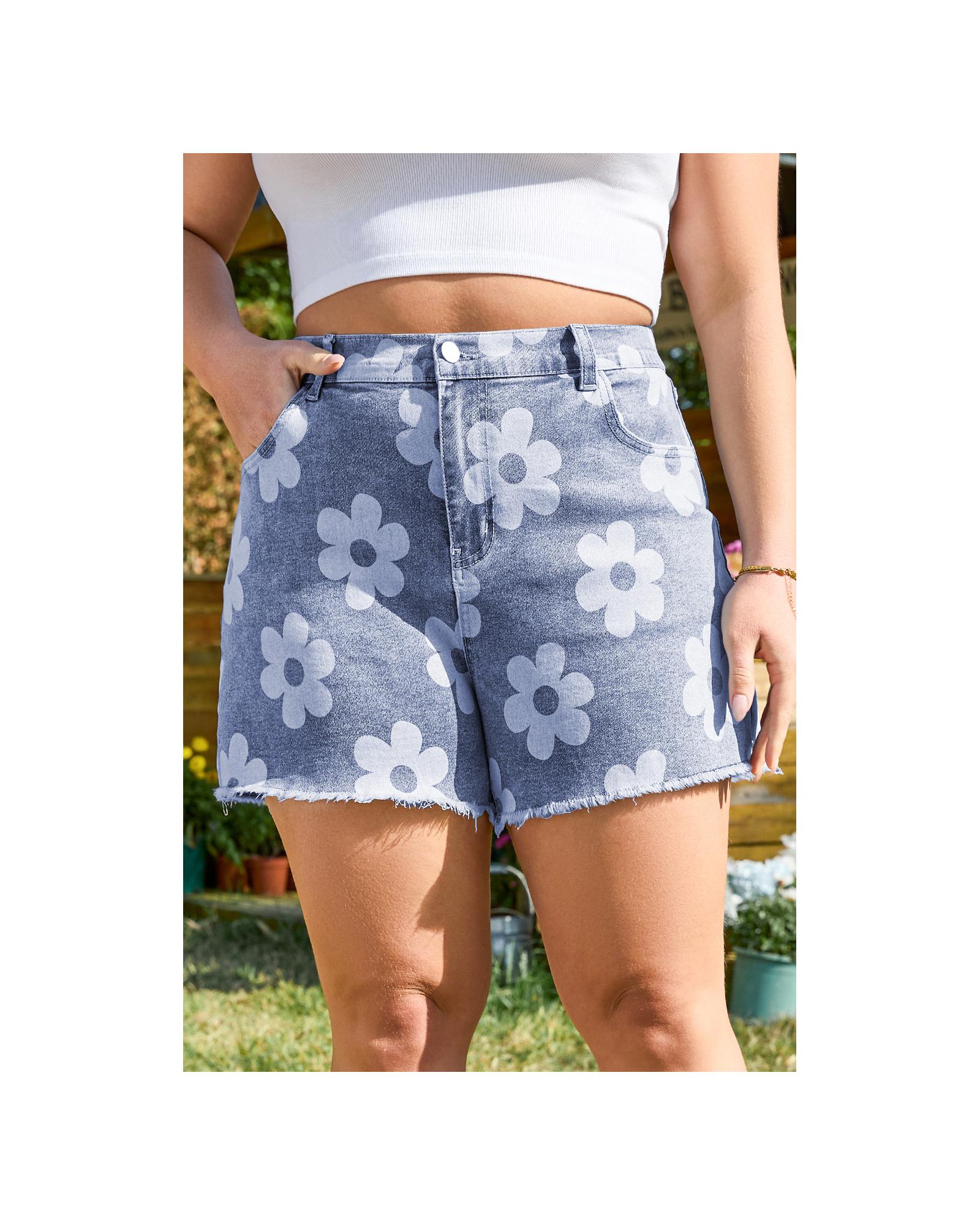 Ashleigh Blue Floral Pattern High Waist Raw Hem Plus Size Denim Shorts – 3X