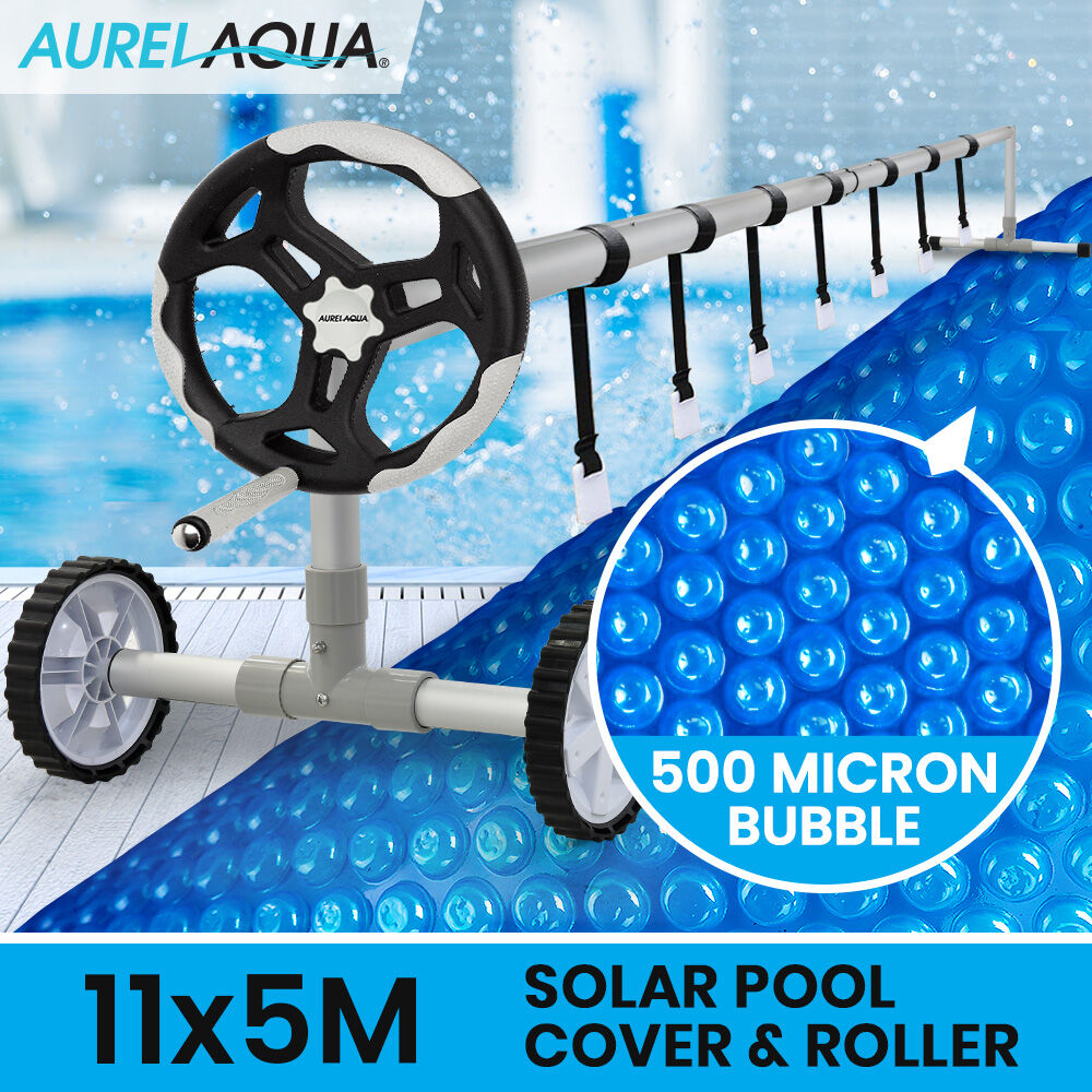 AURELAQUA Pool Cover Roller and 11x5m Solar Blanket 500 Micron, Blue