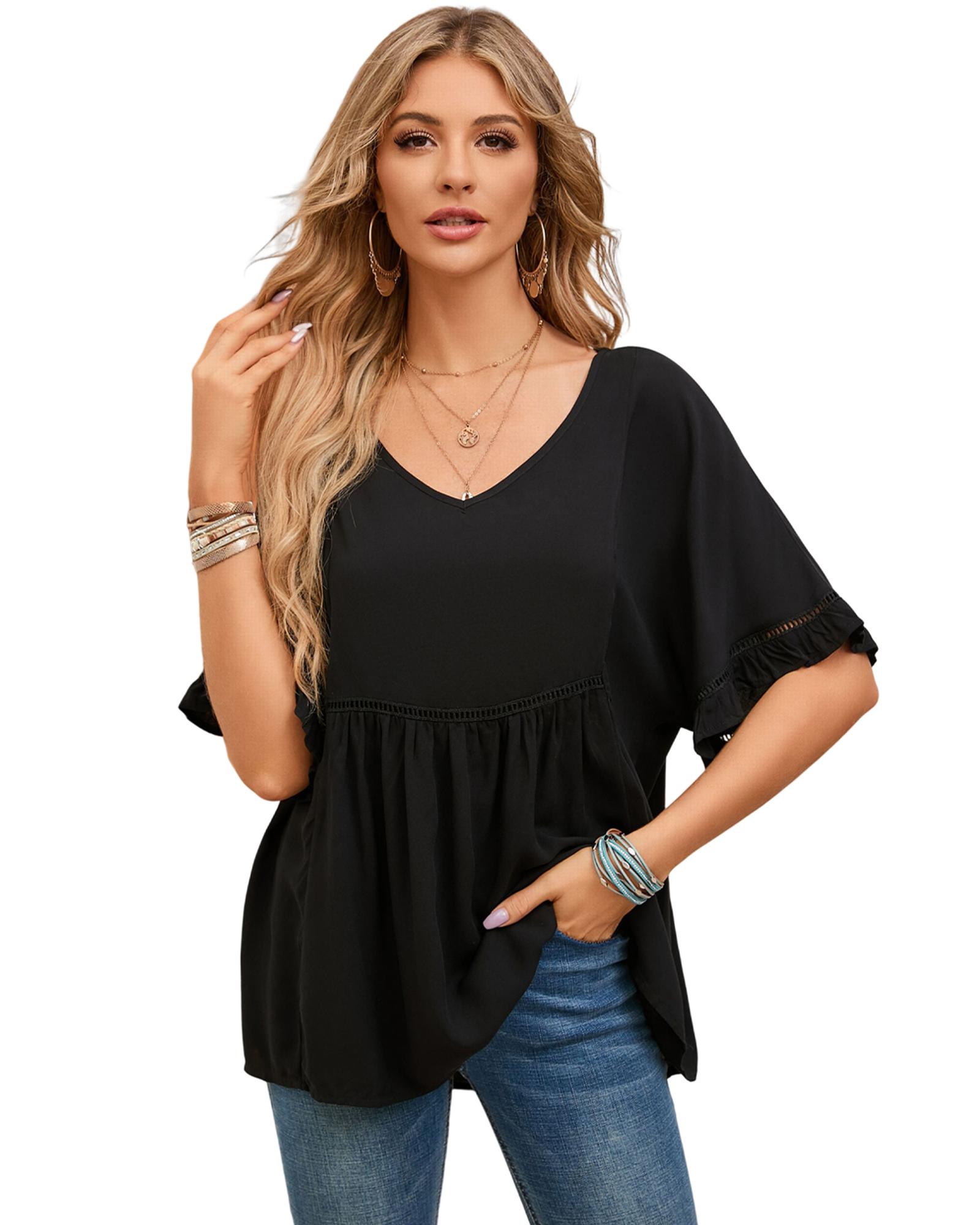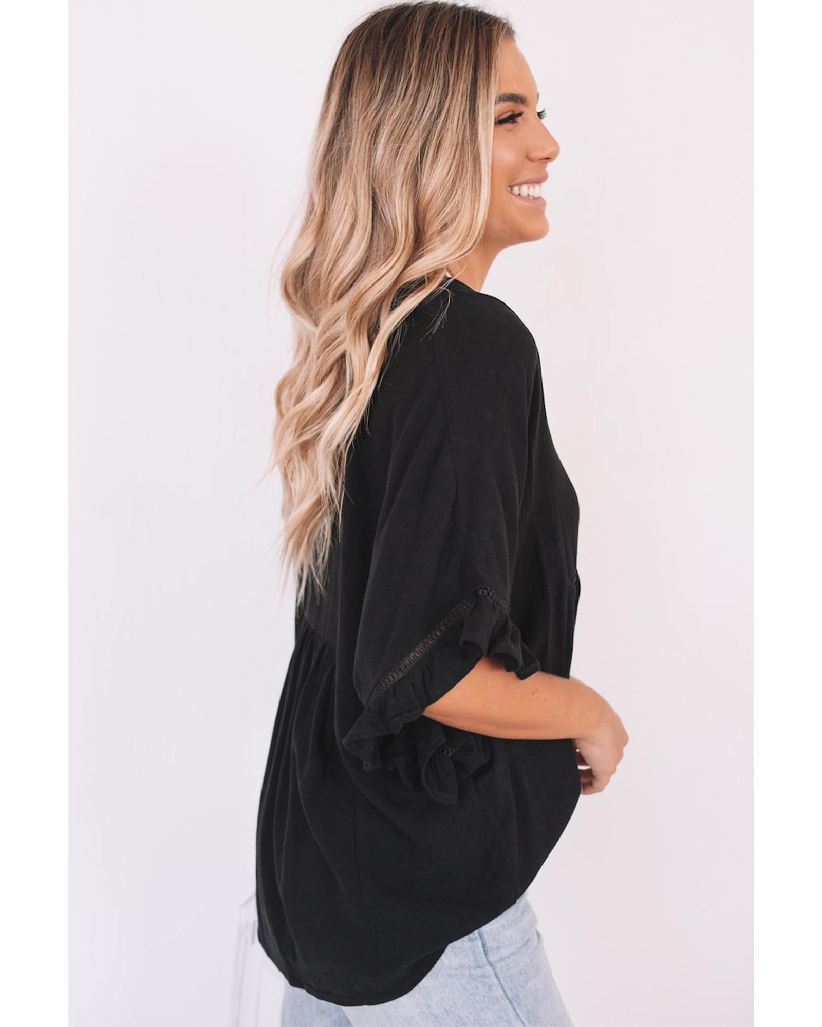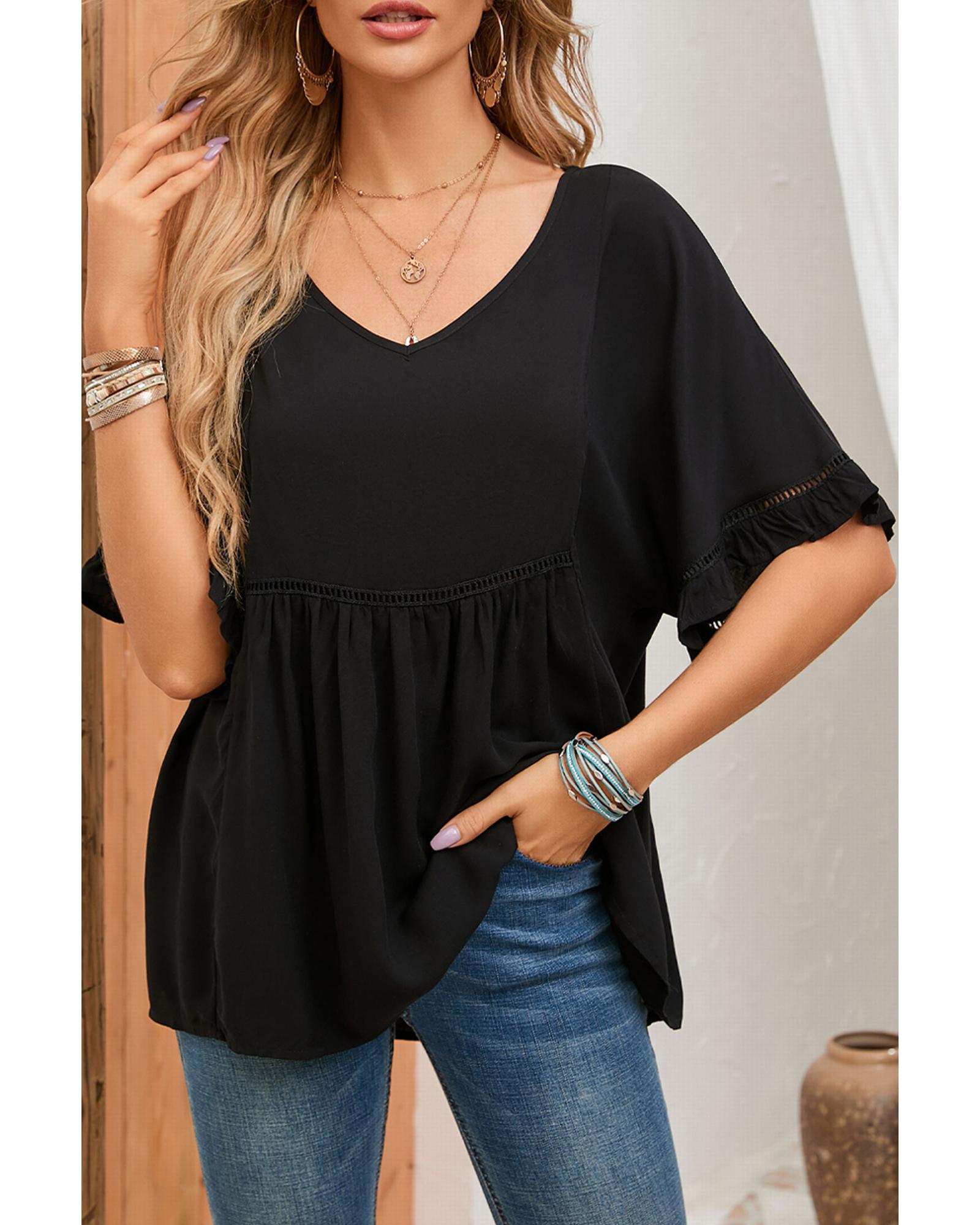 Azura Exchange Black Ruffled Lace Detail Loose V Neck Top – M