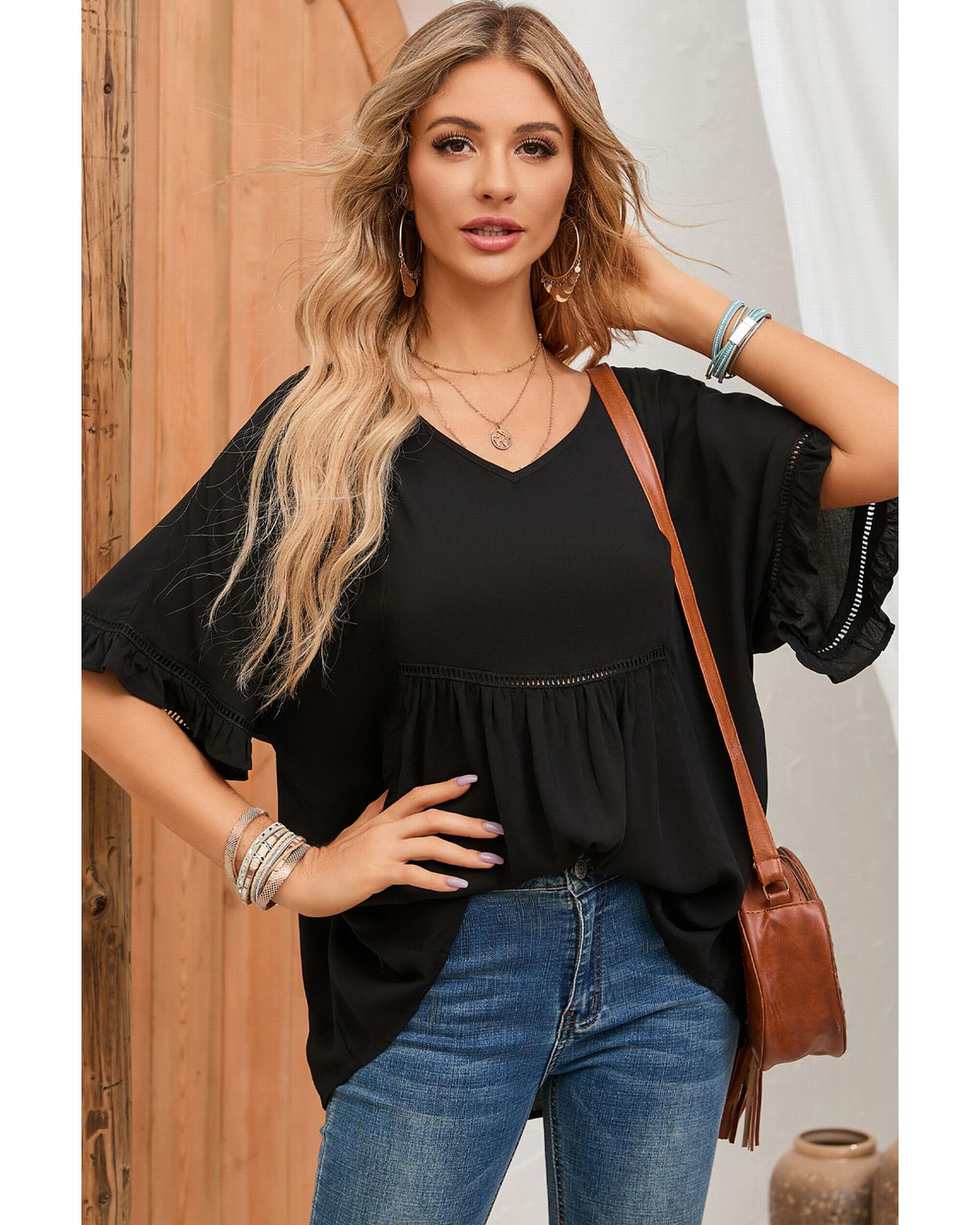 Azura Exchange Black Ruffled Lace Detail Loose V Neck Top – XL