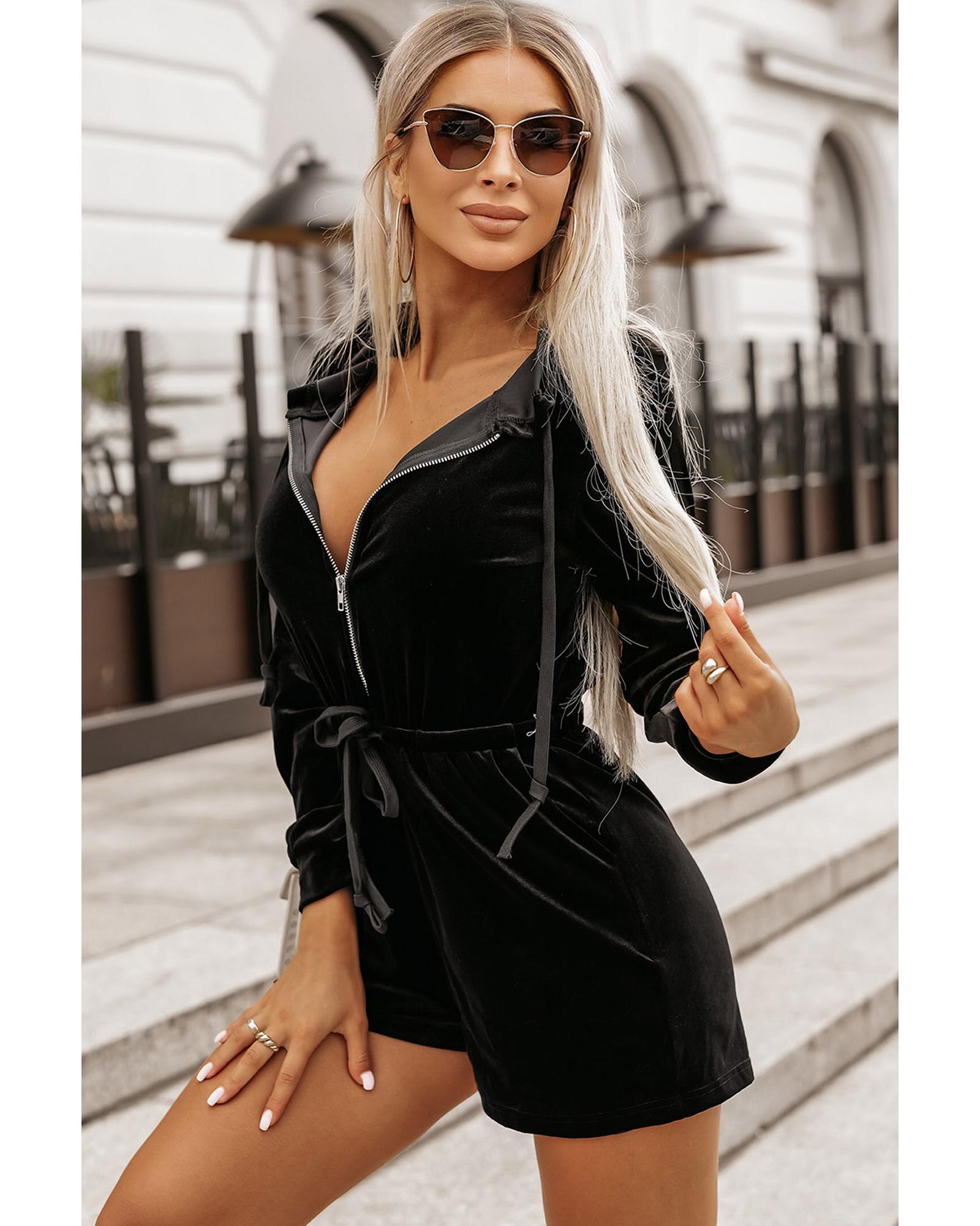 Azura Exchange Black Velvet Zipped Front Drawstring Waist Hooded Romper – XL