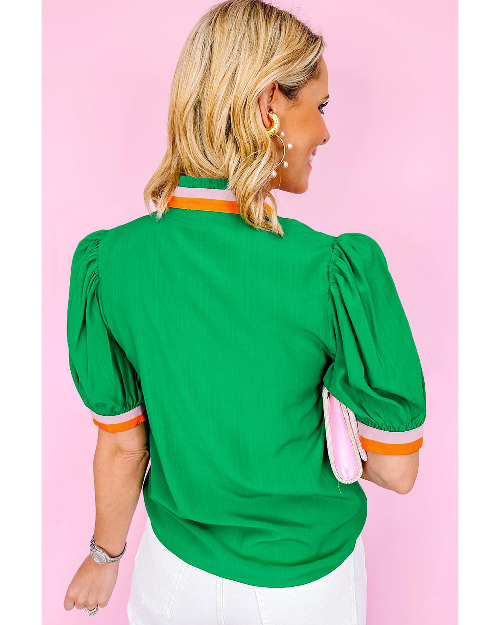 Azura Exchange Bright Green Colorful Trim V Neck Short Sleeve Blouse – S