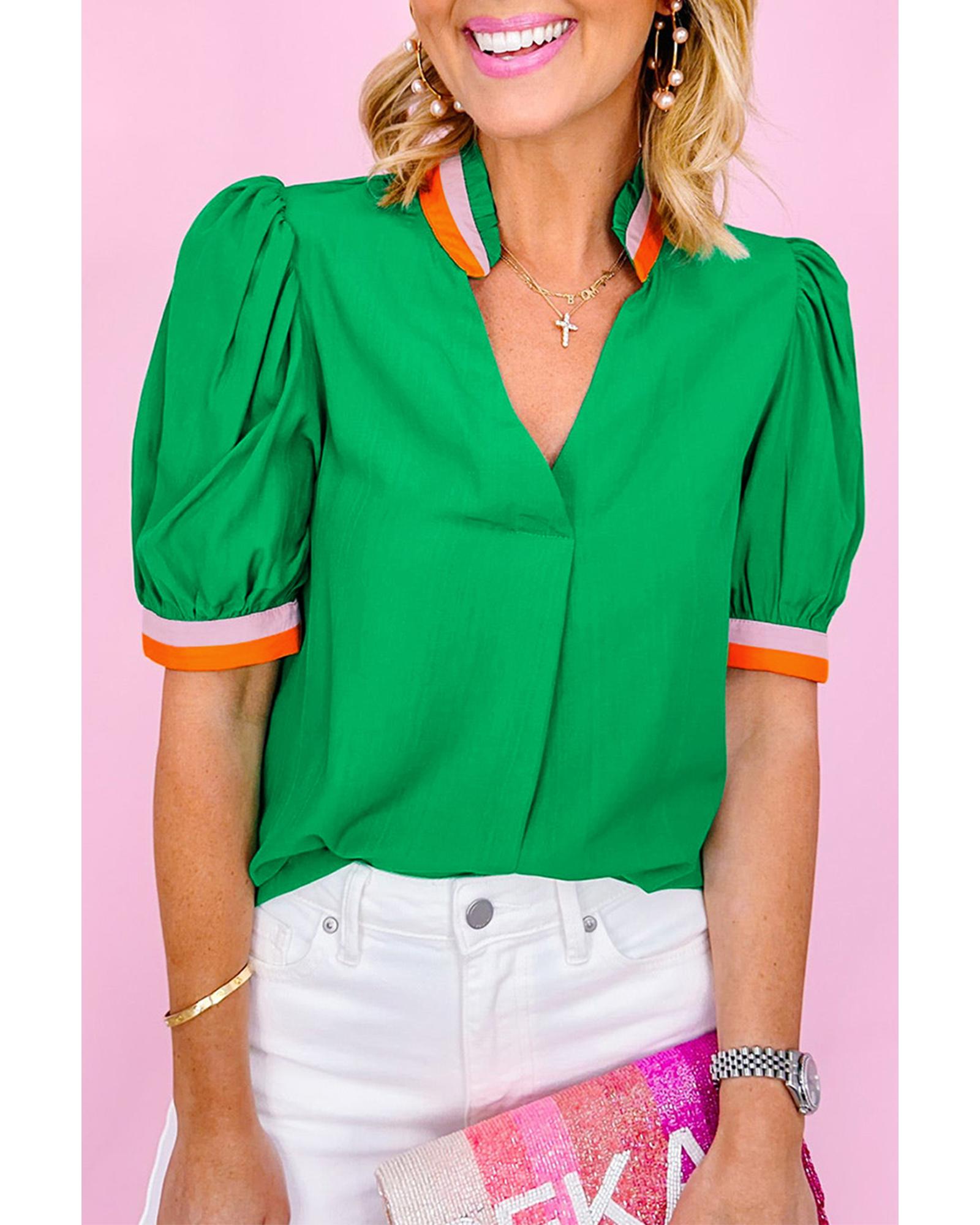 Azura Exchange Bright Green Colorful Trim V Neck Short Sleeve Blouse – XL